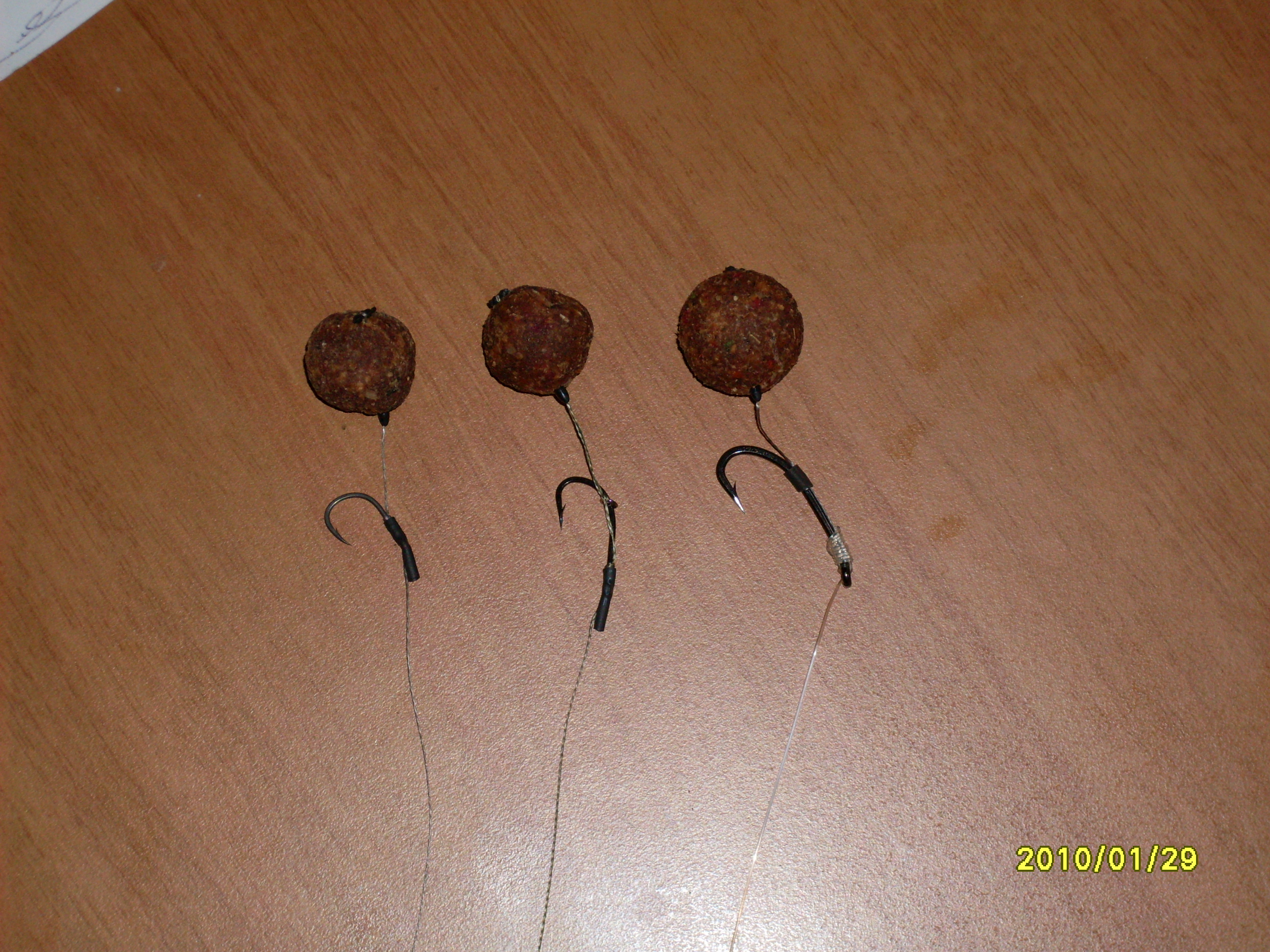 il primo a destra va bene, il primo a sinistra invece mi sembra sproporzionato (anche se la distanza può andare bene, sempre meglio più distante che troppo vicino) o la boiles troppo grande o l'amo troppo piccolo ... vedete voi ...