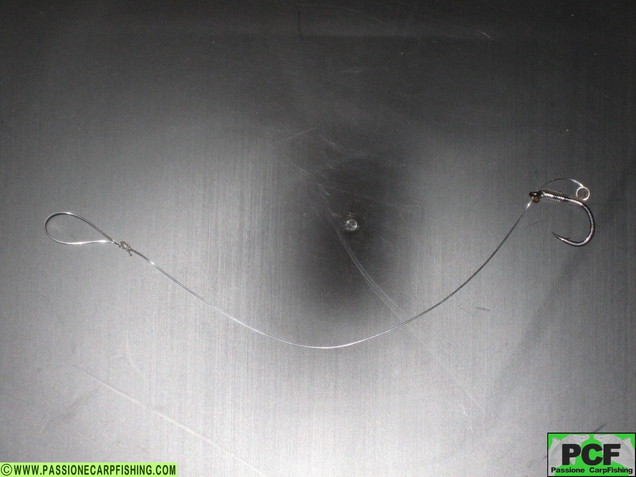 • Tubicino di silicone 1,5mm di diametro. Tagliare uno spezzone di fluorocarbon di 25 cm, farlo passare dall’esterno dell’occhiello dell’amo fino a fare avanzare 3 cm circa. Fare un “senza nodo” facendo 10 spire circa, quindi serrarlo. Fare passsare, prima dal filo quindi dalla punta dell’amo un pezzettino di 2/3 mm di tubicino di silicone (attenzione, il tubicino deve essere abbastanza grande da passare dalla punta dell’amo senza rompersi ma non deve essere cosi grande da scorrere sull’amo). Successivamente inserire l’anellino di acciaio. Infilare lo spezzone di fluorocarbon “avanzato” dall’esterno dell’occhiello e bruciarlo fino a formare una pallina che non permetterà al filo di uscire dall’occhiello. Il D-rig è un tipo di amo molto efficace per gli inneschi pop-up, forse il più utilizzato dai carpisti. Per inneschi pop-up, ricordiamoci di inserire sul fluorocarbon vicino alla base dell’amo, un piombino o della pasta in tungsteno di adeguata grammatura.