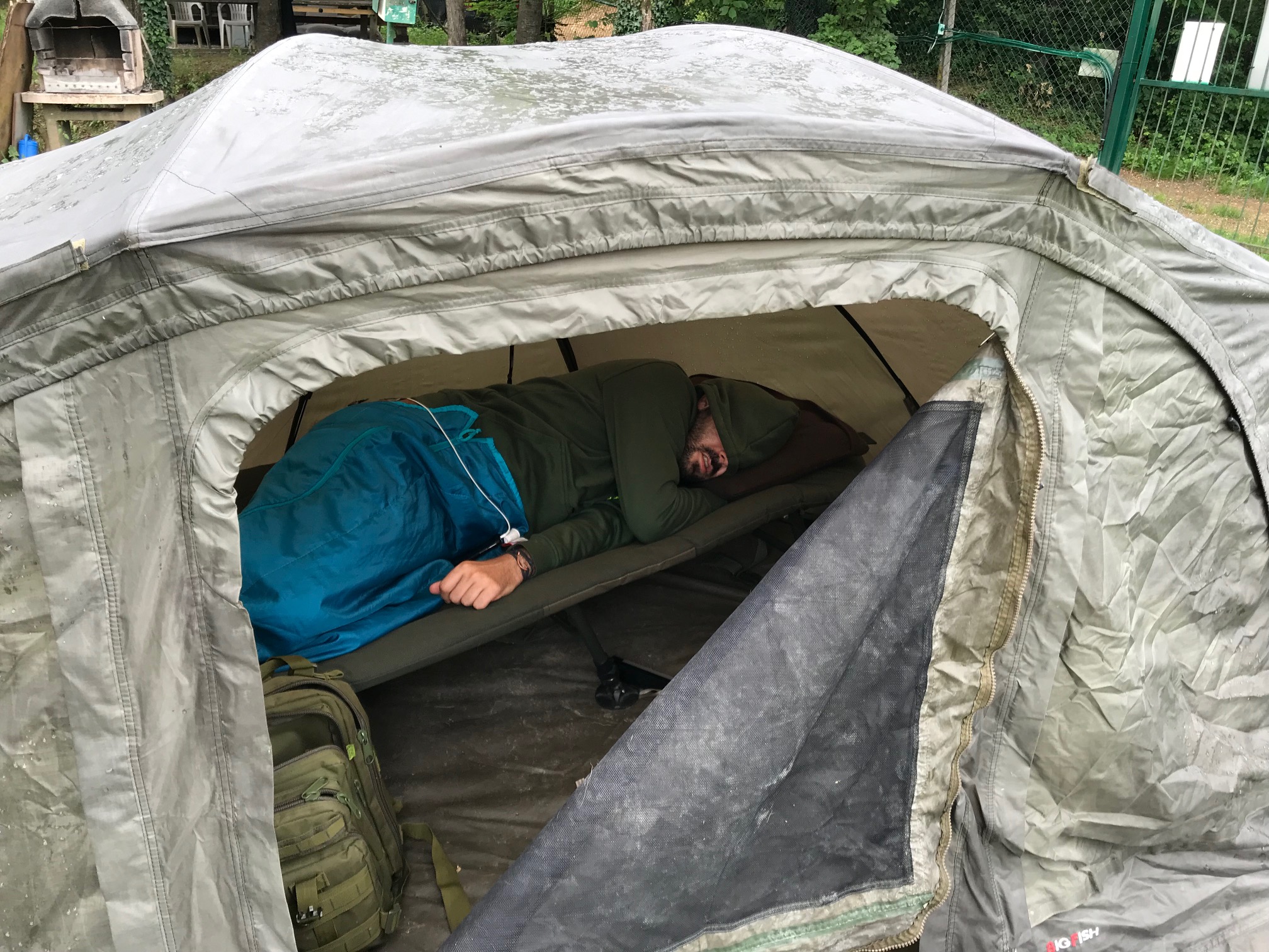 Passa un'oretta buona, prima che l'acquazzone lasci spazio a un'occhiatina di sole. Decido quindi di alzarmi, Andre invece se la ronfa ancora beato in tenda.