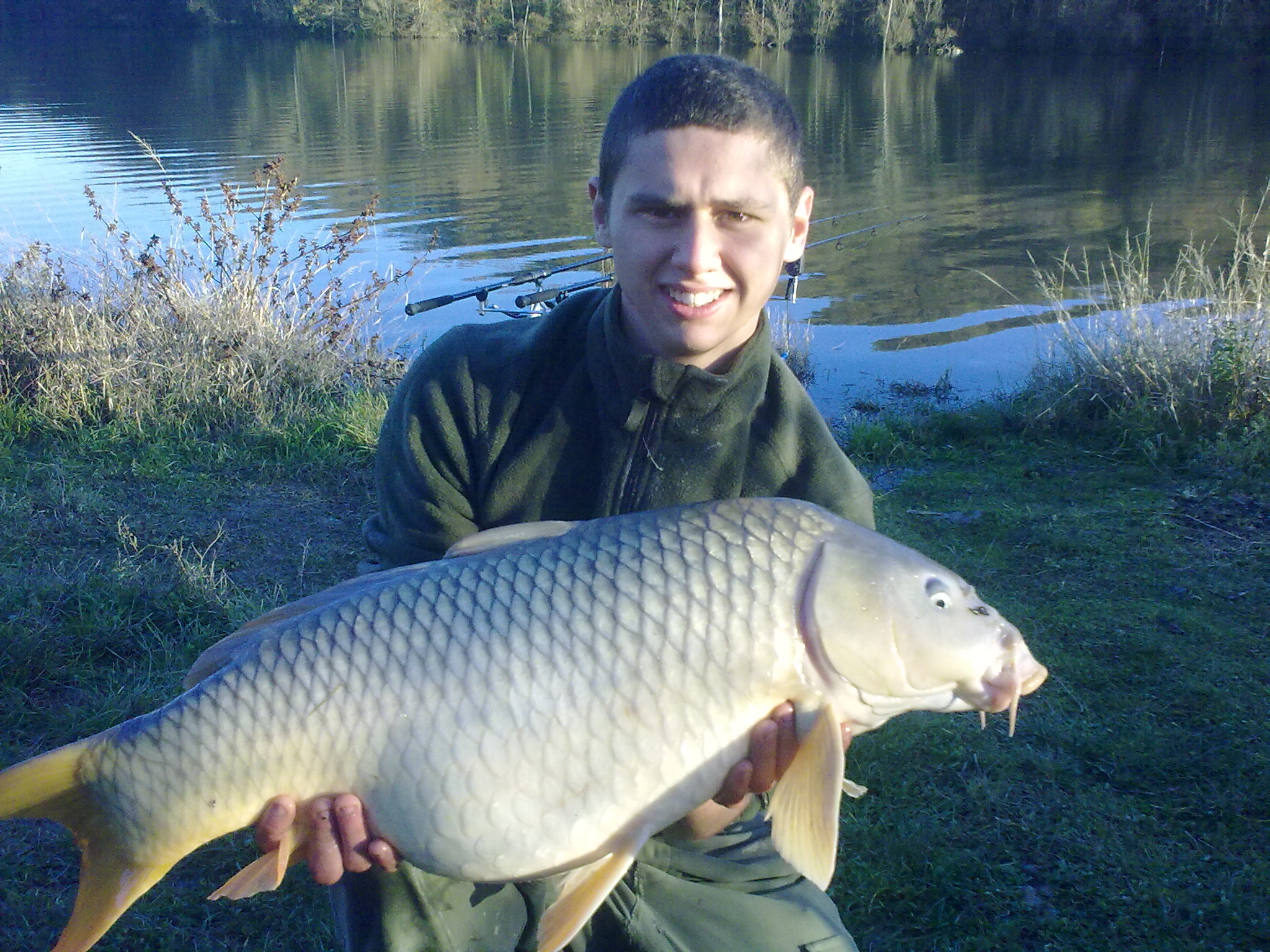 lui è IL CARPISTA!!!!!perche dovete sapere che da lui le carpe sotto i 14kg non vanno....mah....tutto convinto a parlare di attrezzature..eco scandagli...gommone(se voi lo avete buono...fidatevi...il suo è meglio!!!!) i mulinelli della daiwa...del box di casa pieno di roba...la minuteria..!!!!madonna quanto parlava!!!!comunque...torniamo a noi...a inizio pomeriggo arrivano 5 romeni con un daily...e si mettano a pescare,dove?ma a un metro da dove avevo lanciato!!!! vabè...dopo aver imprecato 10 minuti levo tutte le canne e sposto il pod...senza nemmeno cambiare gli inneschi prendo il barchino del mio amico e rilancio la prima canna....in quel mentre il mio amico ha una partenza...ferrata...c'è e da come la canna si piega non sembra piccola,dopo 15 secondi slamata..vabbè..lancio la seconda canna e lascio il barchino agli altri per rilanciare..dopo 20 minuti tocca alla terza canna...innesco singolo da 18 al kiwi...la porto a 130-150 metri dalla riva vicino a una pianta semi sommersa...dopo una mezzoretta(forse 40 minuti) sento un bip...è la canna di sinistra...nulla...2 minuti dopo comincia a suonare la centralina...arrivo sul pod...era la canna di destra...ferrò..c'è!!!!devo essere sincero...veniva su come se fosse stata morta..però sentivo un po di peso...dopo 5 minuti che recuperavo(e i bracci non ne potevano piu vista la distanza...) eccola...in quel mentre erano venuti a vedere due rumeni che erano li...avevano addirittura lasciato quello che stavano facendo...cioè cercare di tirare fuori il furgone dalla mota...prima di guadinarla partono le scommesse.. che ridere!!!segnava 12,7 con il coccodrillo...10 kg pari pari...che bello...facciamo le foto e prima di rimetterla in acqua il rumeno vuole che gliela dia a lui...pagandomi ovviamente...senza pensaci un secondo gli rispondo con un "no secco e la lascio andare... a quel punto david spinto dalla curiosità gli chiede come le mangiano le carpe loro...testa per la zuppa e il resto alla griglia!!
