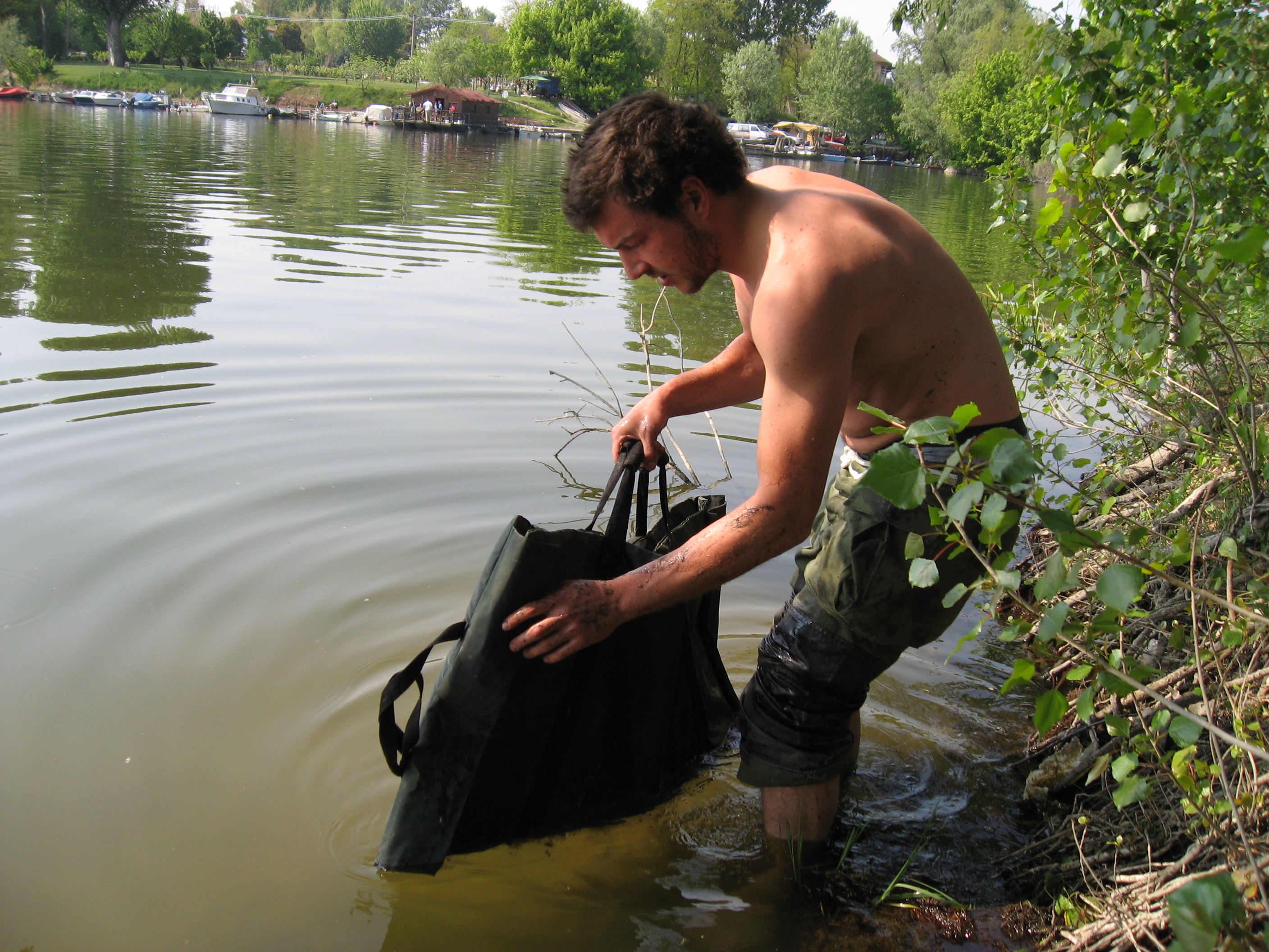 Ma questa è la prefazione,perchè lunedì 18,infoiato dalla settimana prima sento il robi e gli dico "ma oggi?" e lui al volo "alle 7 in camping!" perfetto!! ed eccoci li,carichi come molle alle 8 siamo in pesca! le ore passano tra birrini e stizzini ma i segnalatori tacciono... ogni 10 min controllo che la frizione sia aperta,che il segnalatore suoni,ma niente... "oh robi,ma che ca--o succede?";"ma che ne so,settimana scorsa a nastro oggi puppa..."... Le esche sono le stesse,doppia boiles da 24 al pesce,ma niente.... tra l'altro non si vede un salto,solo breme che fan casino e fregano sotto riva e tognini che vanno a siluri che passano col barchino ad 1 metro dalle canne.. "ma sta in la! la vaca at to ma--r!!!" risposta in tedesco che non si capisce.... Poi verso le 4 arrivano amici con viveri ed ecco che bippppp!!! corro e ferro! eccola che parte e mi fa fa partire la frizione,la tengo,il robi ha già in mano il guadino,arriva sotto e.... "Ca--o ma è enorme!!!!" presa a guadino dall'esperto robi,messa sul tappeto e pesata... 13KG!!!!!! alla seconda uscita!!! mia mal!!! ole!