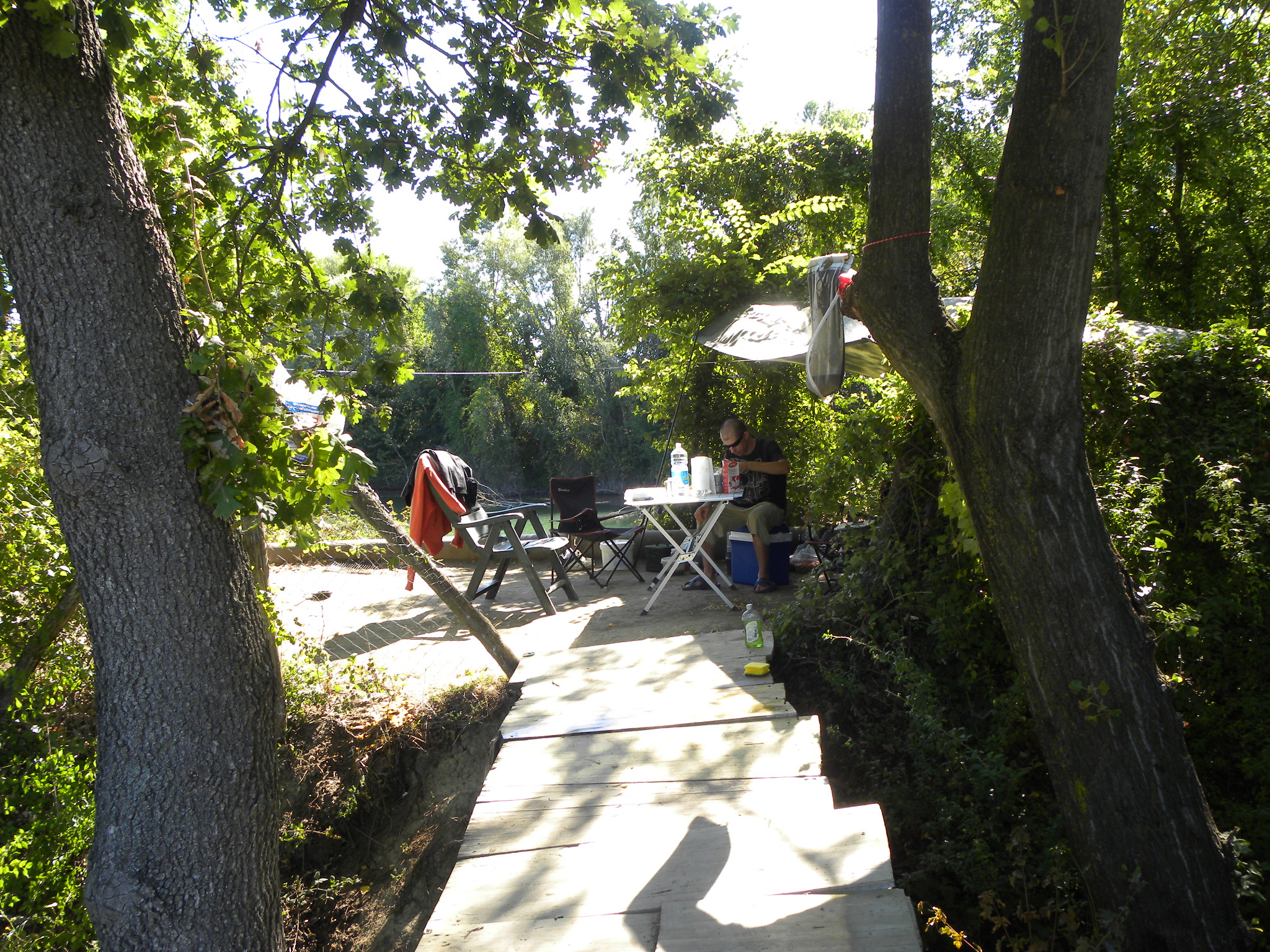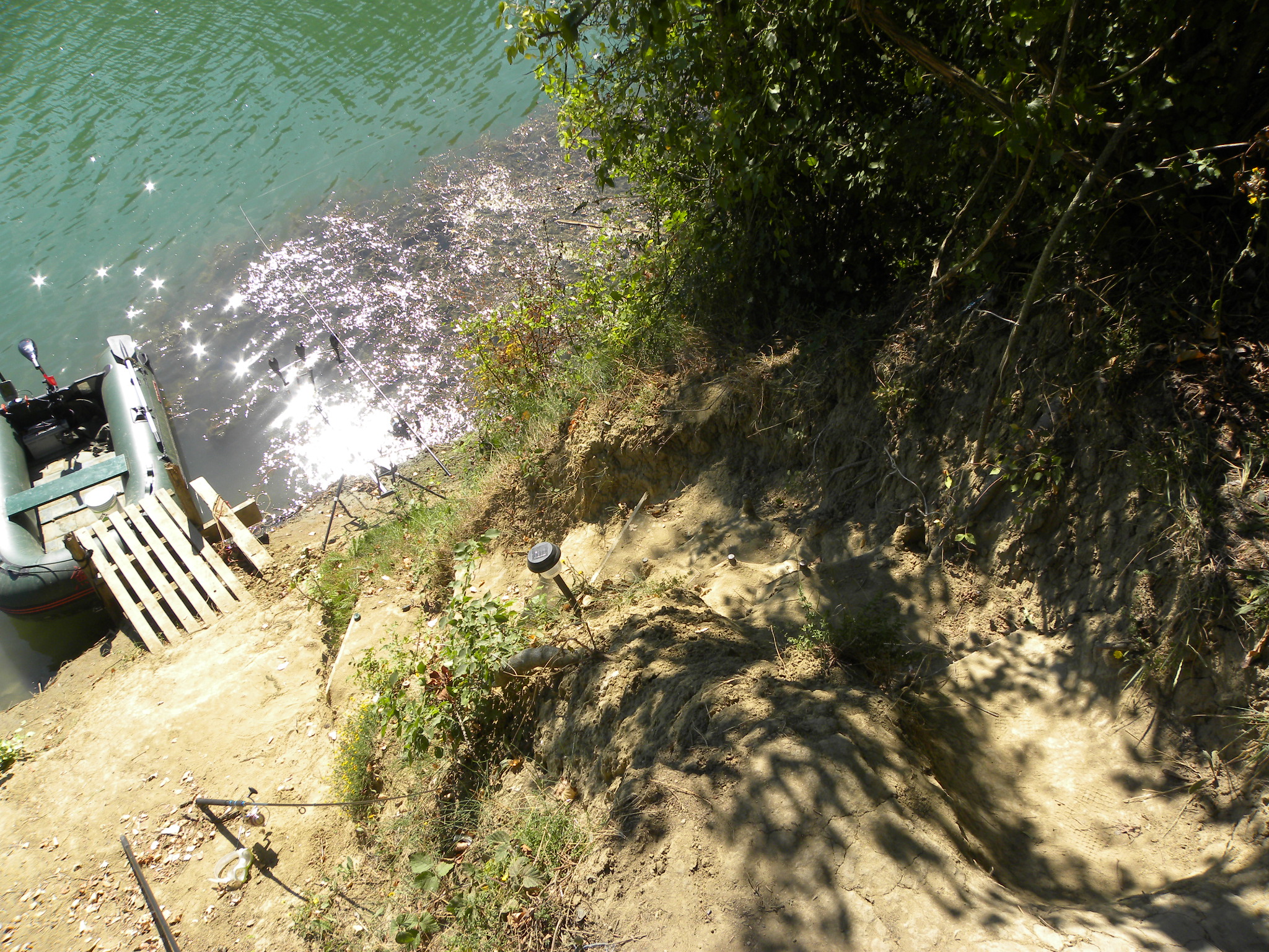 scarichiamo tenda e il piccolo necessario e ci mettiamo in branda in attesa dell alba...ma nn cè verso di stare in tenda...è aperta ma ci saranno quasi 40 gradi dentro..pazzesco!!!decidiamo quindi di iniziare a scaricare il tutto e di montare il campo sotto la luna..finalmente arriva l alba e tutto è pronto persalpare e scandagliare il posto..ma...comincia a piovere come dio la manda e quindi niente..caffeino e cicchino in tenda finchè nn smette..il sole rfà capolino dietro le nuvole e visto che nn piove piu partiamo..io scelgo la parte a sx dove il lago inizia ad aprirsi e il socio l ansa sotto la posta..(dico sotto la posta perchè siamo con la tenda tre metri sopra il lago) caliamo il tutto con calma e con un accurata pasturazione e comincia l attesa....il caldo si fà sentire e iniziamo a partire le prime boccie di birra.