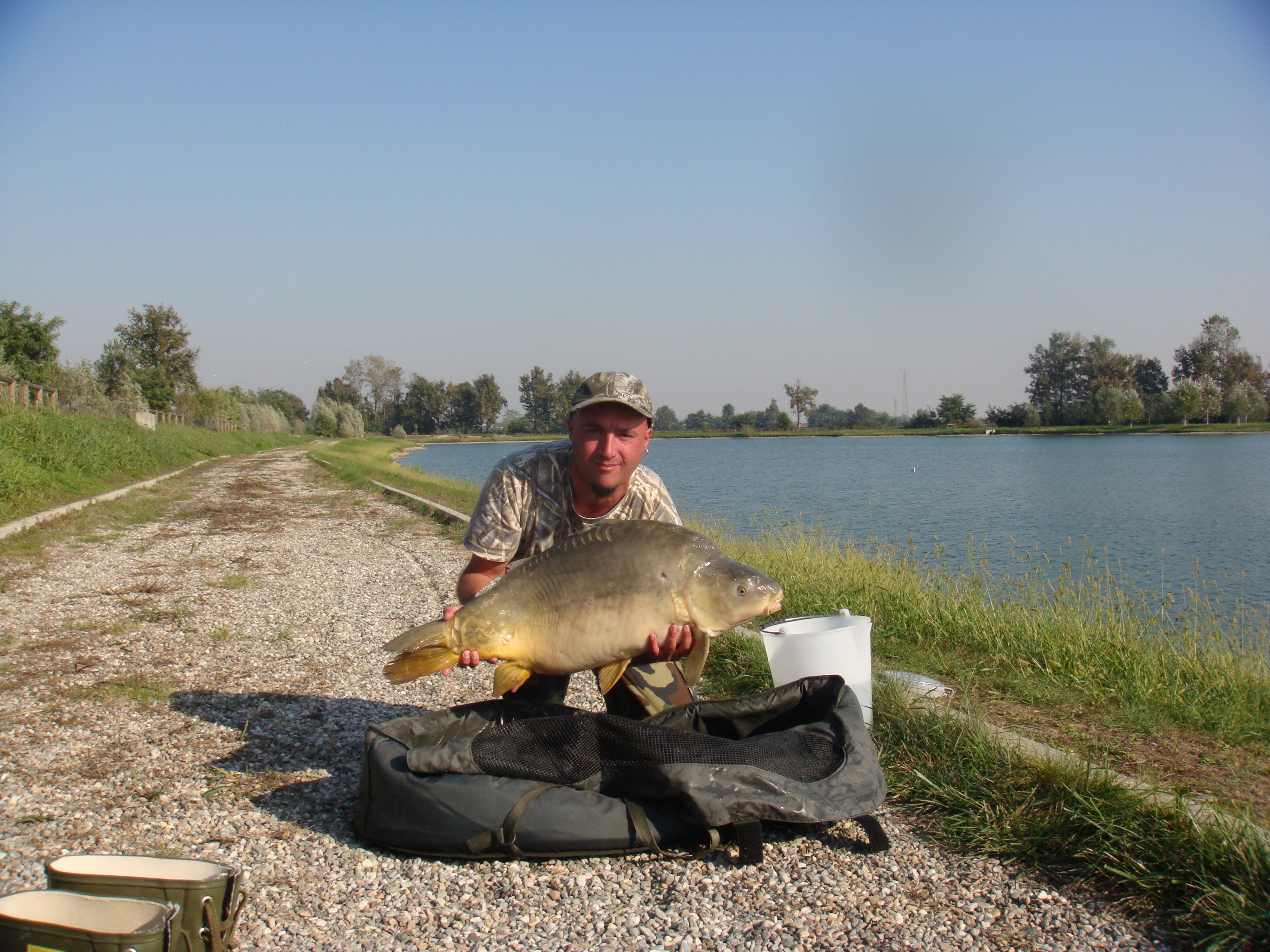 per me è iniziato tutto il giovedi mattina, alle 08:50 sono arrivato al lago e ho fatto subito l'incontro con il freddo pungente ma poco importa sapendo i bei giorni che avrei passato. Montato tutto l'ambaradan faccio un po di plumbing pasturo con qualche kilo di granaglie preparate con tanta cura e amore e verso le 11 sono in pesca, un paio di ore e arrivano le prime partenze un paio di regine sui 7/8 kg e una specchi di 3 incazza.. da paura. Più tardi nel pomeriggio inoltrato una canna inizia a bibettare mi avvicino di corsa, immobile come un segugio al primo movimento prendo la canna e ferro sento subito che è qualcosa di grosso ma non enorme fino a quando portato a vista d'occhio vedo un amur che ai miei occhi sembrava gigante, mi aspetto subito delle grandi sfuriate ma non so il perche entra in guadino senza fare troppo il matto, porto sul materassino e dopo le dovute cure l'ago della bilancia segna 14kg. Da li fino a venerdi catture ogni due ore con una bella regina di 9kg. Sono le 14 di venerdi pomeriggio, mi faccio pranzo e all'ultima forchettata di pasta parte una canna all'infuriata, volo al pod, ferro e un peso enorme mi porta a passeggio per il lago quando finalmente riesco a portarla in zona guadinatura vedo arrivare una specchi enorme con super gobbone, incredulo guadino e porto sull'materassino subito la medico avendo notato alqune ferite qua e la (non causate da me), arriva il momento della pesatura e l'ago della bilancia si ferma a 15kg lo pesata e ripesata con e senza tara e erano sempre 15kg. Piu tardi arriva Ska, che ringrazio tanto di tutti i consigli che mi ha dato della grande compagnia e delle squisitissime pietanze che ha preparato. Più tardi ancora ormai notte inoltrata sono arrivati broccoli e mr.madness, ringrazio tantissimo anche voi siete dei grandi avete fatto un sacco di kilometri per farci una pescata tutti assieme,