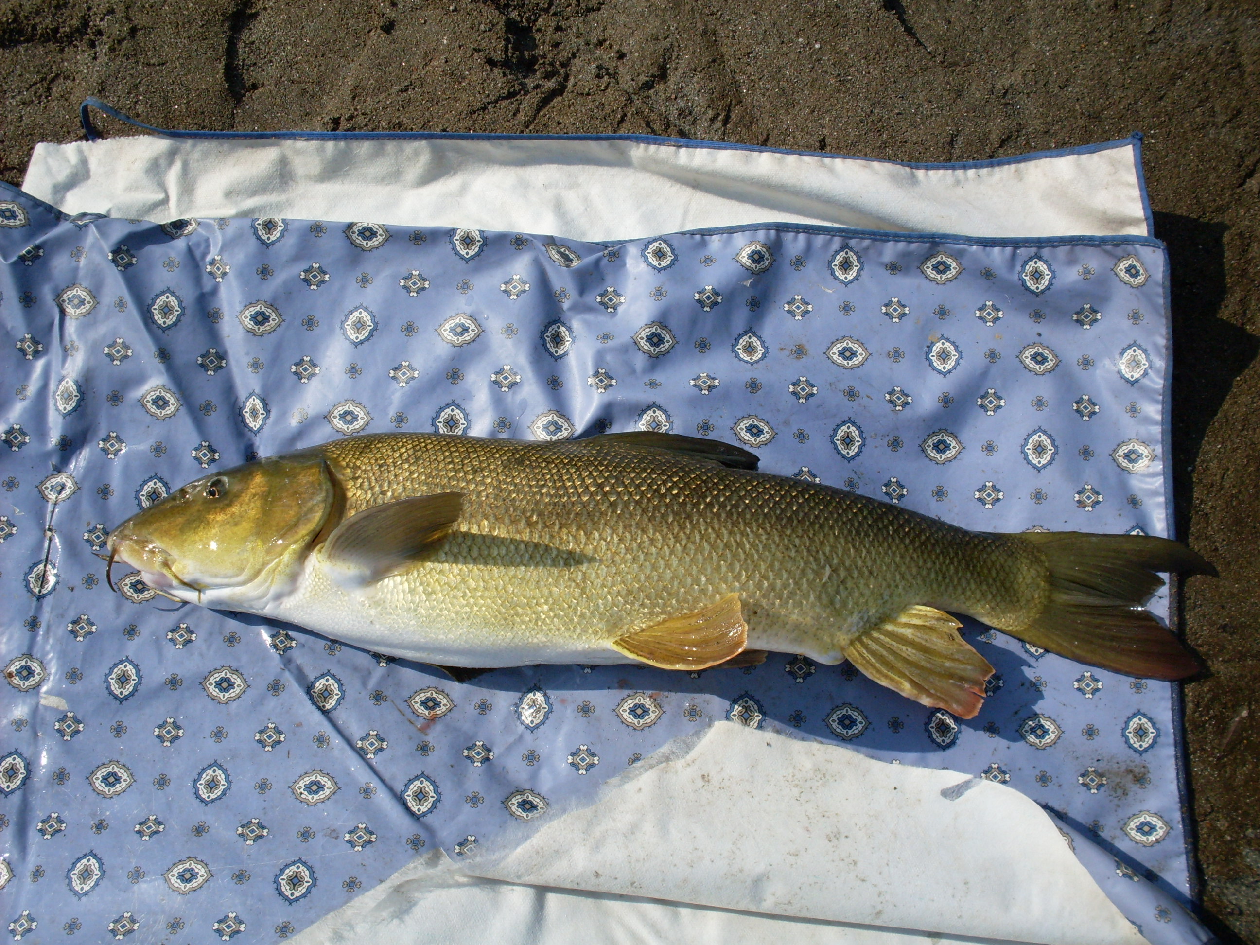 c'è dentro una tovaglia e degli stracci, per fortuna c'è sabbia, allargo la tovaglia sulla sabbia , guadino il pesce, lo slamoe cerco il cavalletto per la foto in autoscatto ma non lo trovo, decido di fare la foto sul materassino e lo rilascio,