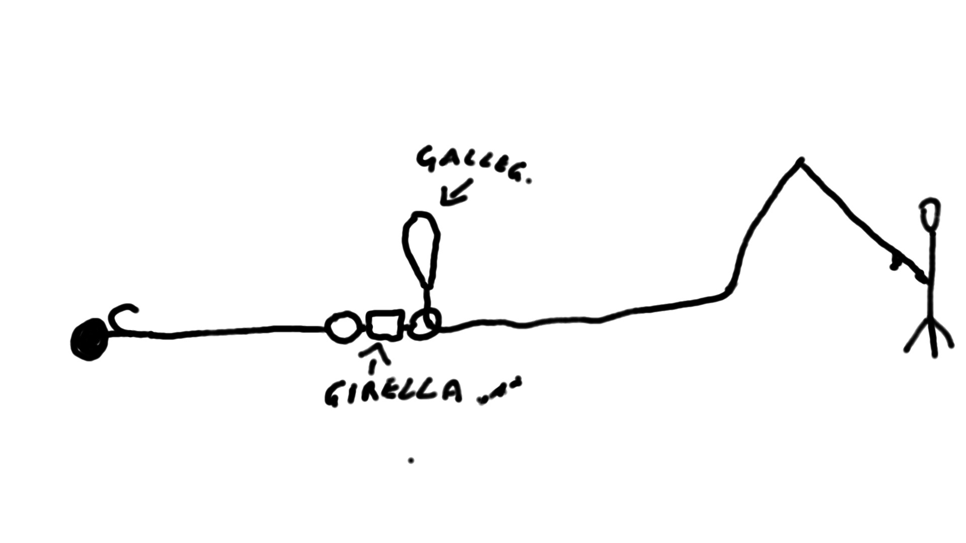 Pensando e ripensando mi e' venuta in mente una montatura che vi illustro di seguito, dove dopo aver lanciato apriamo l'archetto per far salire il galleggiante e individuare cosi' l'innesco....che ne dite e' realizzabile?