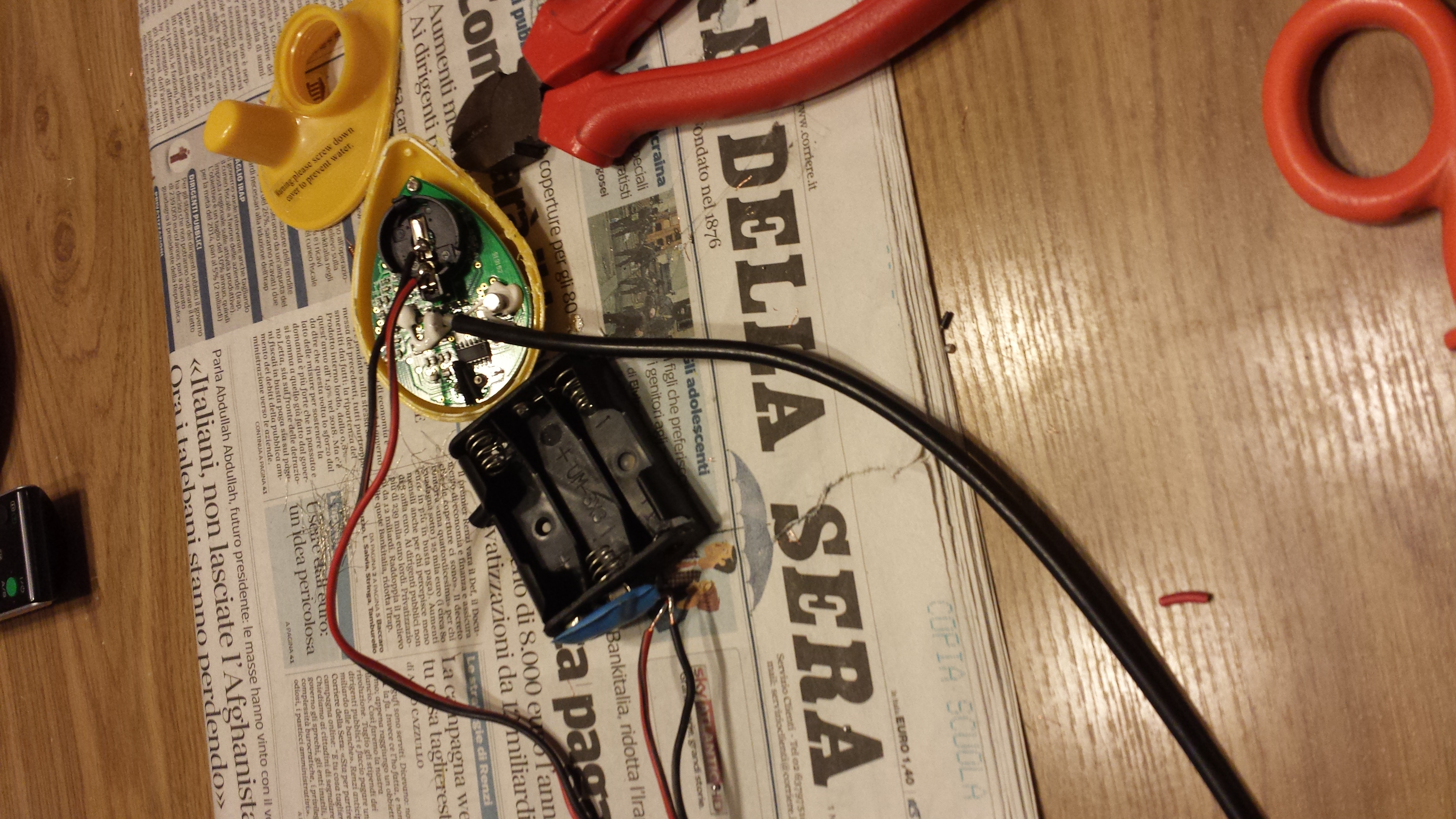 All altra estremità applicate un porta batterie da 3 . cioè due pile stilo.. La batteria originale è una a pastiglia da 3v che sostituendola con due stilo avremo sempre 3v ma più amperaggio e quindi più spunto e l eco avrà un segnale leggermente migliore . per ora sono fermo qua.
