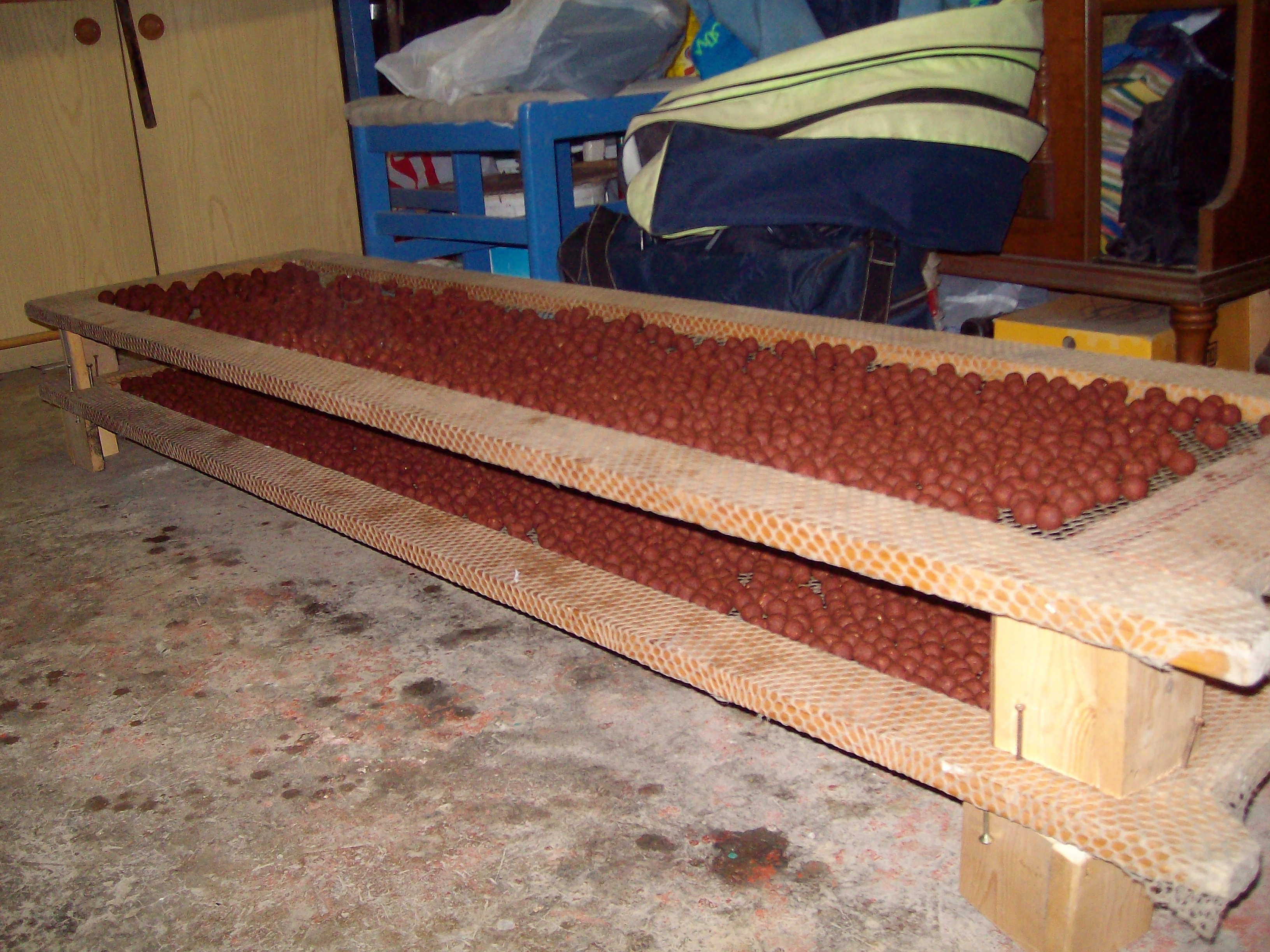 ciao a tutti! anch'io due anni fa' mi sono costruito uno "scaffale" di legno di 4 piani x asciugare le boiles ed e' una bomba. lo scheletro e' di legno mentre la rete e' quella delle zanzariere. l'ho testato piu' volte e le boiles asciugano benissimo.l'importante e' lasciare 15 0 20 cm di distanza fra una piano e l'altro. a presto,ricky.