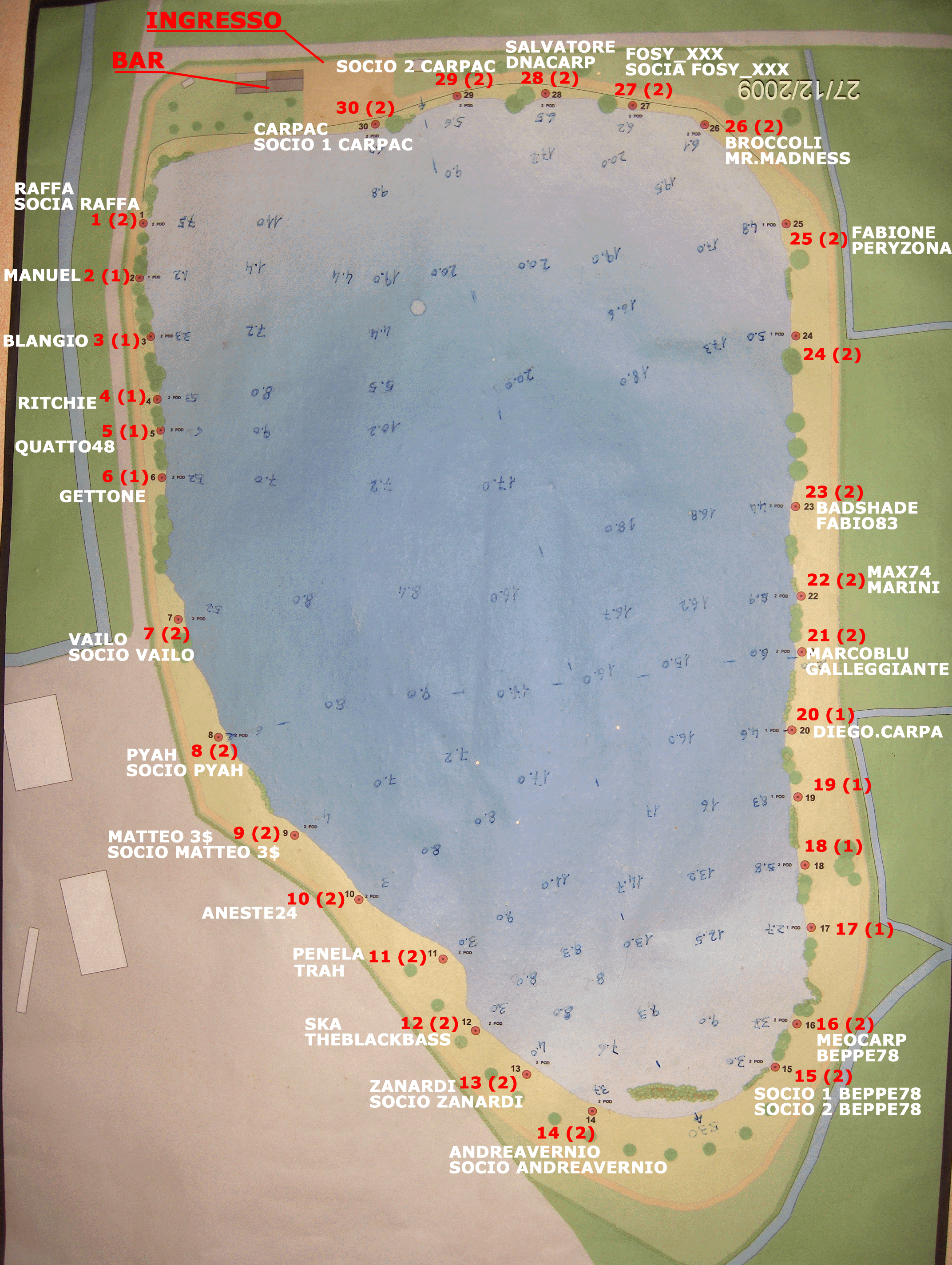 Ragazzi vi posto la piantina del lago con l'assegnazione delle poste, le poste sono state assegnate cercando il miglior compromesso, tengo a ricordare che è un raduno e non una gara vera e propria