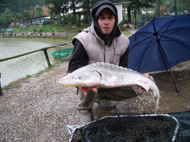 ,oggi nonostante il tempaccio che cè stato tre irriducibili si son ritrovati a fare una sessione diversa a storioni..ritrovo ore 06:30 in pasticcieria x prima colazione con matte e salva e poi via in macchina direzione lago..arriviamo al lago che piove come dio la manda ma comunque ci accorgiamo che nn eravamo soli e che al lago già altra gente stava pescandio sotto la pioggia..