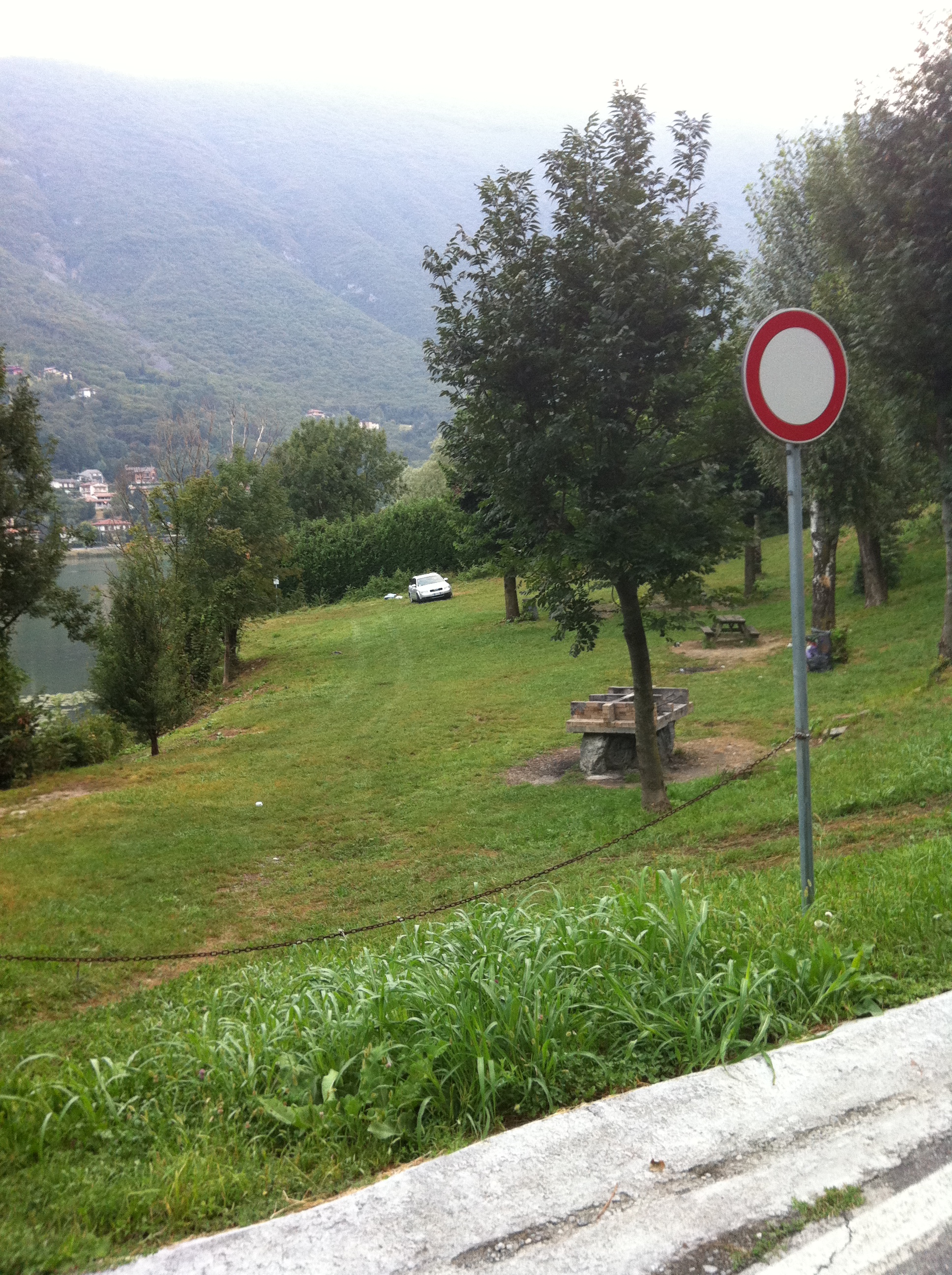 - ore 7, arriviamo alla posta 12 prenotata da quasi 4 mesi e che ti vedo? Un'Audi parcheggiata proprio in riva al lago, in fondo al prato, alla faccia di un evidente cartello di divieto di transito. Dopo un paio di minuti ne esce uno zombie, straniero, e lo avvertiamo che stanno rischiando grosso. Alza le spalle e torna dentro, poi per fortuna dopo poco iniziano a smontare le loro 4-5 cannette a fondo e dopo un pò se ne vanno (avevano anche un piccolo gommone, per inciso). Se avessero voluto restare gli sarebbe bastato spostare la macchina, ma il posto era loro, addio alla nostra sessione