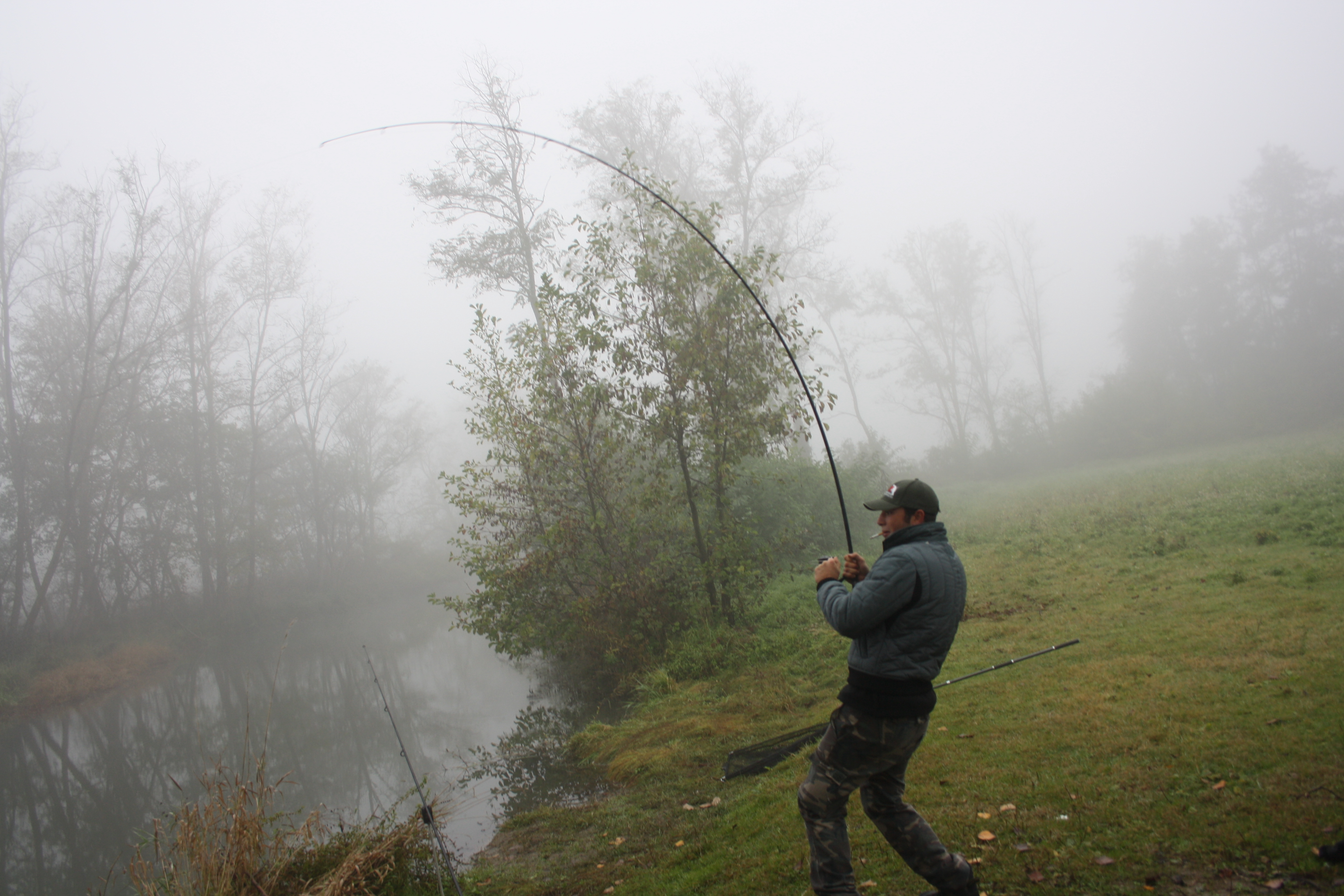 Nel frattempo la nebbia inizia a dissolversi cosi zambo e gian decido di lanciare le ultime due canne... Gian lancia e dopo 3 secondo partenza a razzo e porta una guadino un'altra bella carpa.