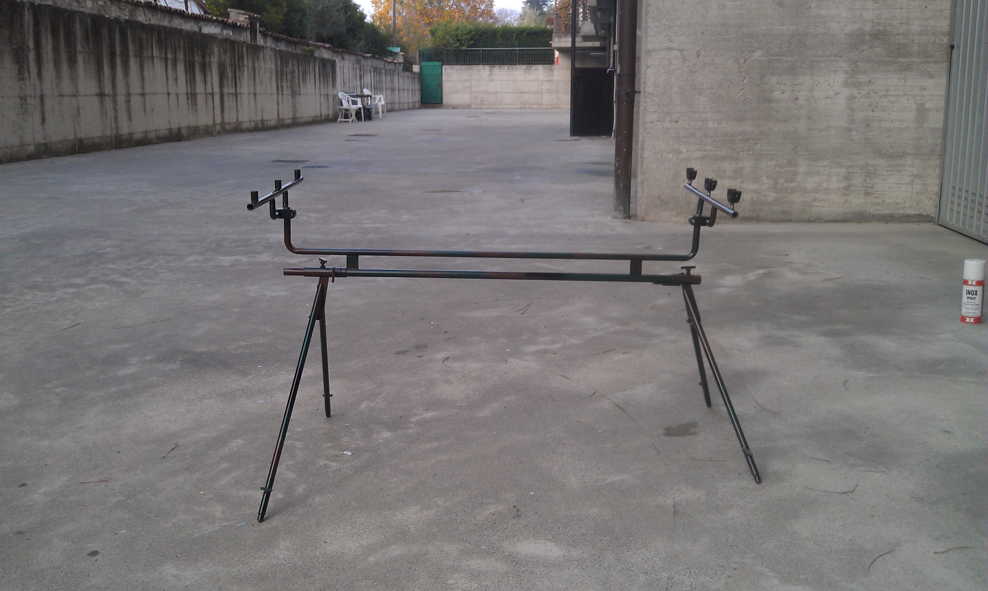 vi piace ? finalmente ho finito il mio poggia-canne ! completamente in acciaio e poi verniciato! piedi regolabili e tutto smontabile per finire in una bellissima sacca fatta dalla mamma !