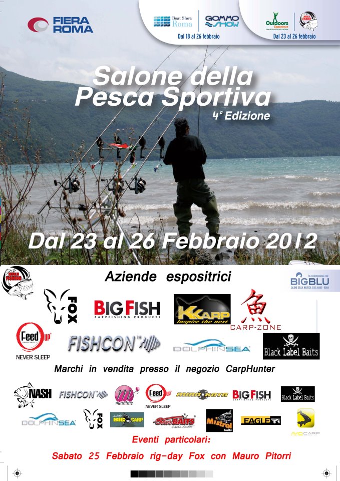 salve volevo ricordare a gli appassionati di carpfishing del centro che dato la neve nn sono potuti andare al carpitaly dal 23 al 26 febbraio si terra' alla fiera di roma il salone della pesca sportiva tra cui troverete molti stand di carpfishing