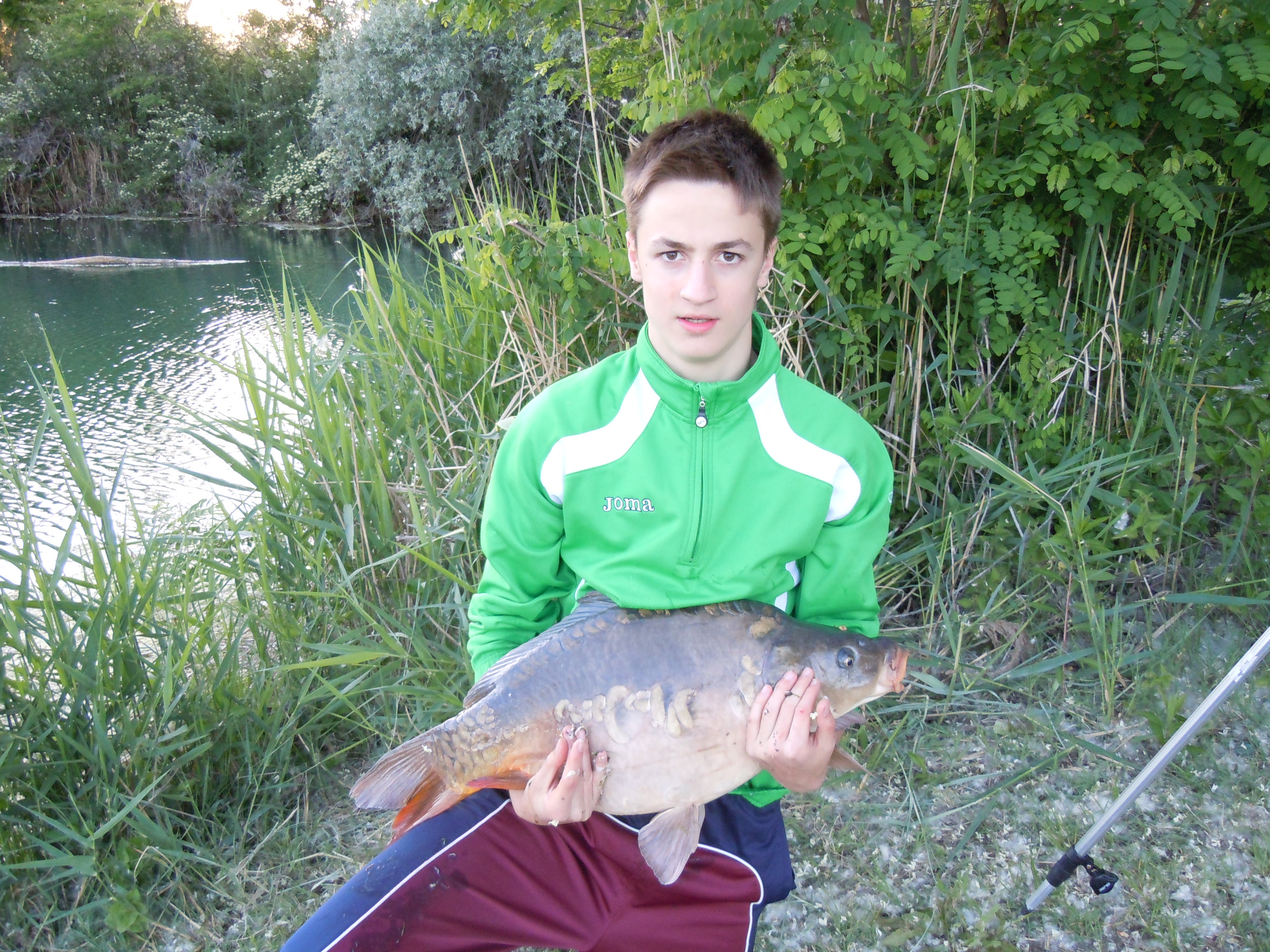 preparo le lenze sulle tre canne, due di esse con boiles affondante singola self-made alla pesca e una con omino di neve banana-pesca. una canna la lancio in prossimità di un albero caduto in acqua, la seconda in corrispondenza di una secca e la terza a profondità elevate su un fondale duro e compatto di grossi ciottoli.Sulle canne nessun segno di attività fino a quando intorno alle 19.45 la canna lanciata verso gli ostacoli segnala una poderosa partenza, così ferro dolcemente e inizio il combattimento.