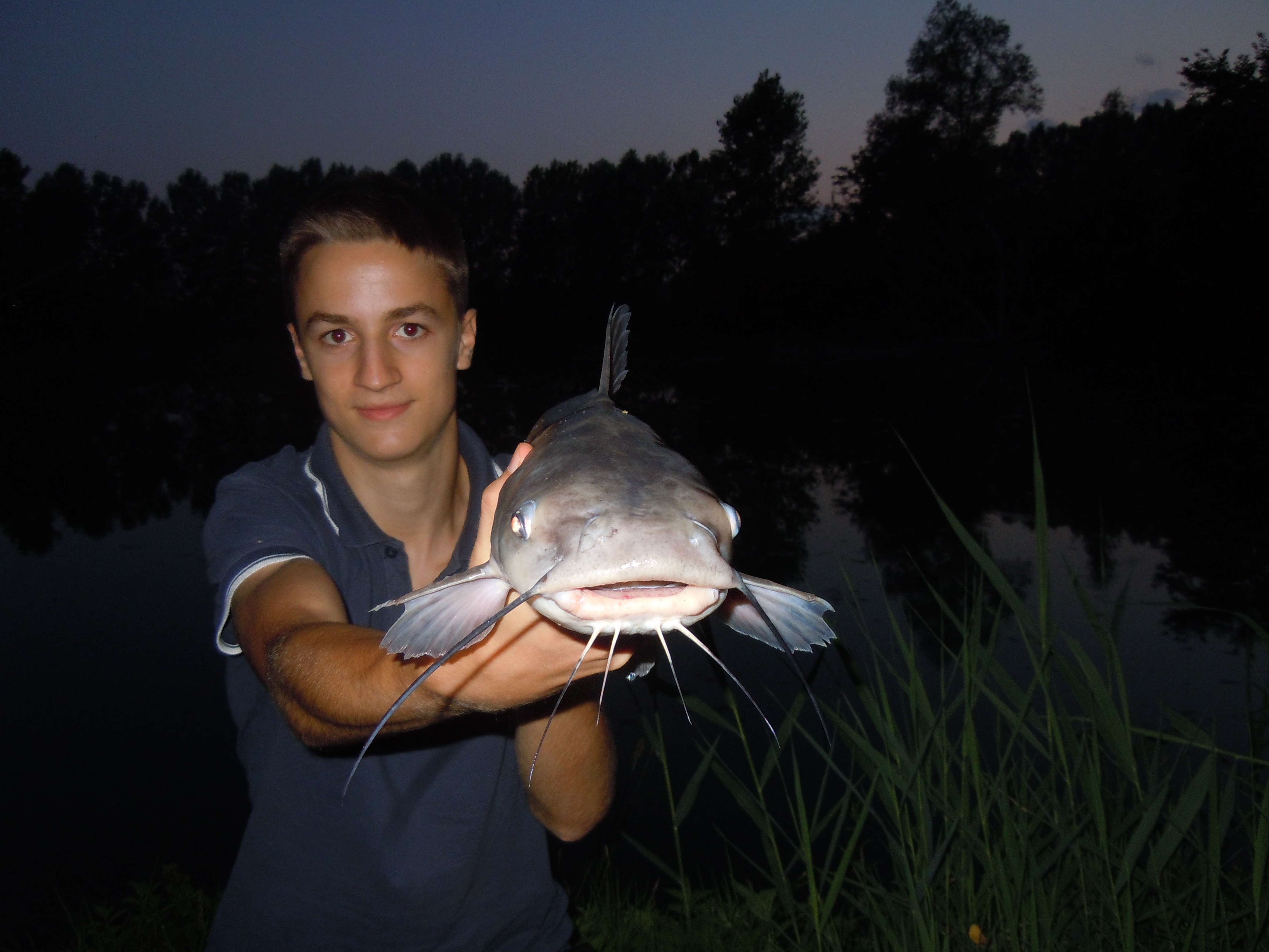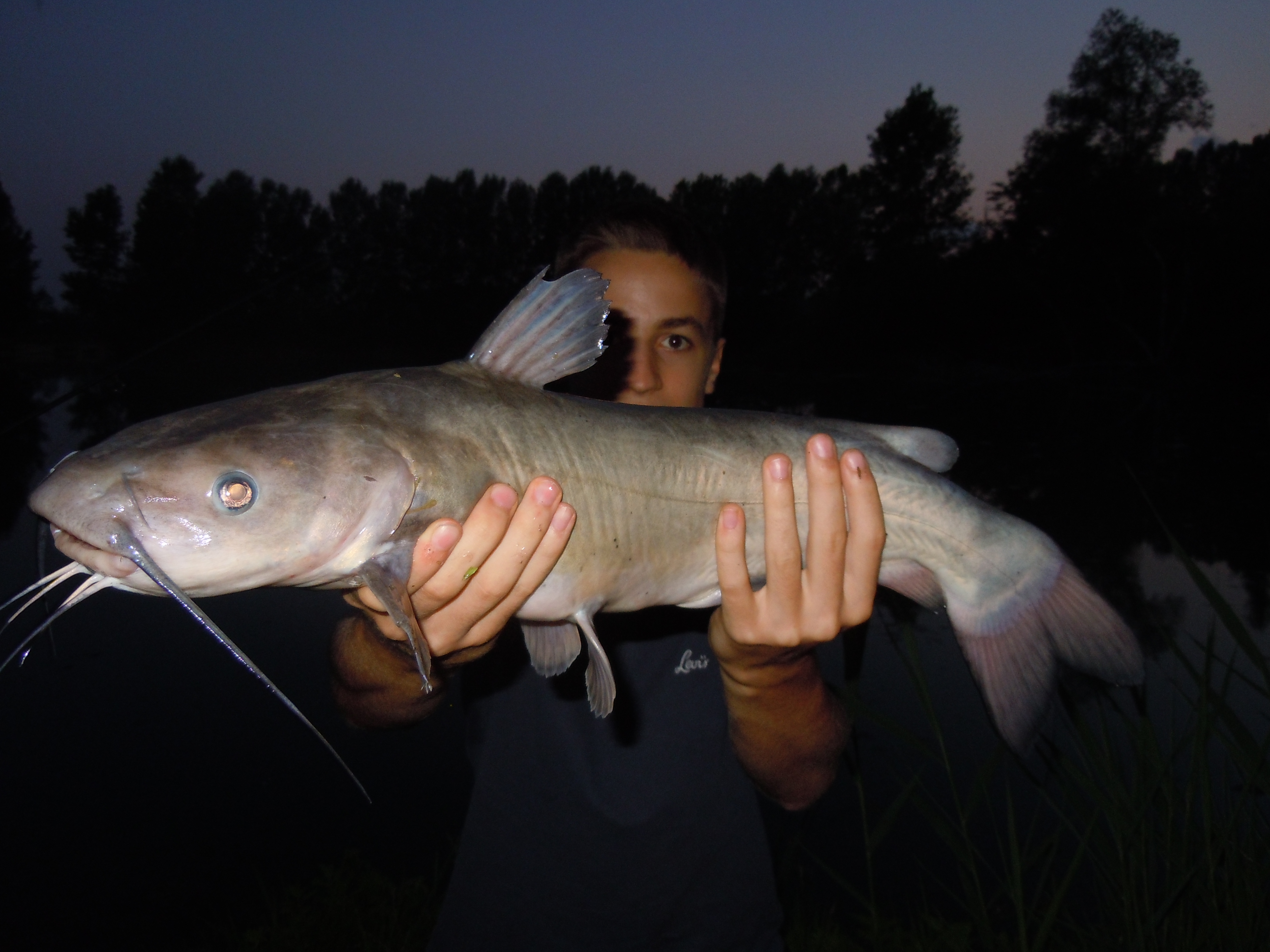 verso le 21.30 la canna lanciata sottoriva parte piuttosto lentamente, facendo suonare l'avvisatore; ferro e sento il pesce in canna. Inizialmente penso che si tratti di una carpetta, ma quando arriva sottoriva inizia a sprigionare una potenza notevole, fino a quando il pesce sale verso la superficie, rivelando la sua identità: è un pesce gatto! :25: