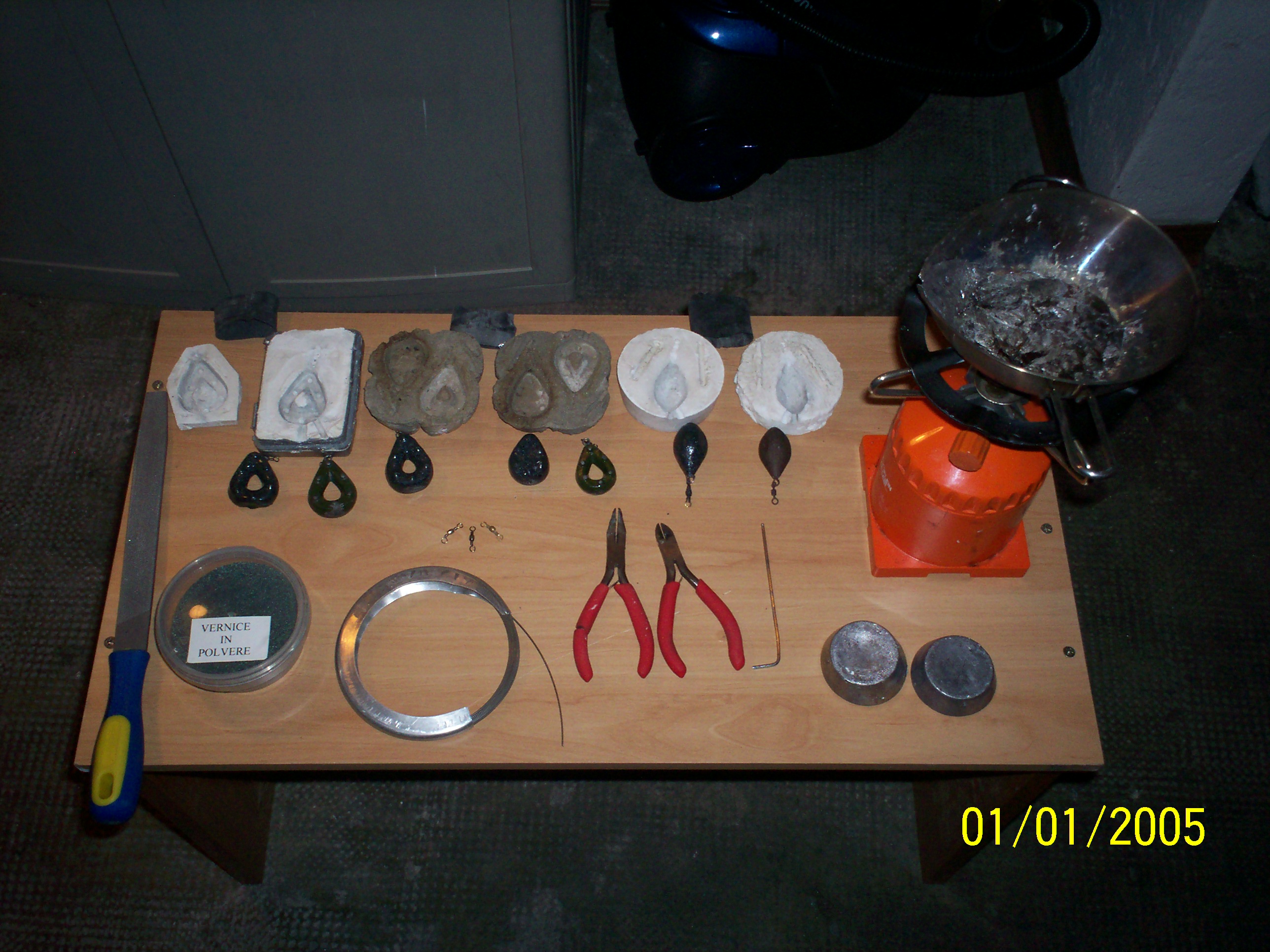 ragazzi inizio con il dirvi tutto l'occorrente per la realizzazione di stampi e piombi: una lima a grana normale, una pinza becchi tondi , una pinza da taglio filo, una pinza normale,del filo d'acciaio, del piombo ,vernice in polvere disponibile nei negozi di pesca, un fornellino da campeggio,del grasso qualsiasi ,un pentolino con manico lungo, girelle con occhielli abbastanza larghi, una chiave esagonale della seconda misura, del gesso in polvere oppure della resina e cosa ancora più importante un luogo dove fondere il piombo che sia abbastanza ampio e arieggiato perché i fumi sono nocivi(attenzione non scherzate anche se fondete piccole quantità la prudenza non è mai troppa anche perché altrimenti costa meno andarli a comprare, questo e solo bricolage per divertimento e non per risparmiare quindi ripeto attenzione ),nel raccontarvi la procedura vi posterò qualche foto in modo da essere più comprensibile , raga scusate continuerò quando avrò un pò di tempo