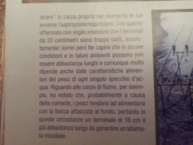 L'idea del terminale lungo penso sia ottima (come affermato nell articolo) nelle cave molto pressate in tutte le stagioni e appunto in particolare in quei posti dove la conformazione del fondale non permette un agevole aspirazione da parte delle carpe dell'esca, non per altro l'esempio fatto da Tiberi riguarda Bolsena lago vulcano, con fondale molto molto roccioso e pieno di "anfratti" ove e necessario in primis calare nello spot giusto ed avere appunto un terminale lungo visto l'abitudine delle carpe in quelle condizioni d'aspirare in lontananza.