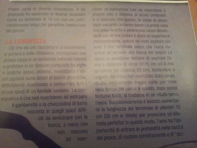 L'idea del terminale lungo penso sia ottima (come affermato nell articolo) nelle cave molto pressate in tutte le stagioni e appunto in particolare in quei posti dove la conformazione del fondale non permette un agevole aspirazione da parte delle carpe dell'esca, non per altro l'esempio fatto da Tiberi riguarda Bolsena lago vulcano, con fondale molto molto roccioso e pieno di "anfratti" ove e necessario in primis calare nello spot giusto ed avere appunto un terminale lungo visto l'abitudine delle carpe in quelle condizioni d'aspirare in lontananza.