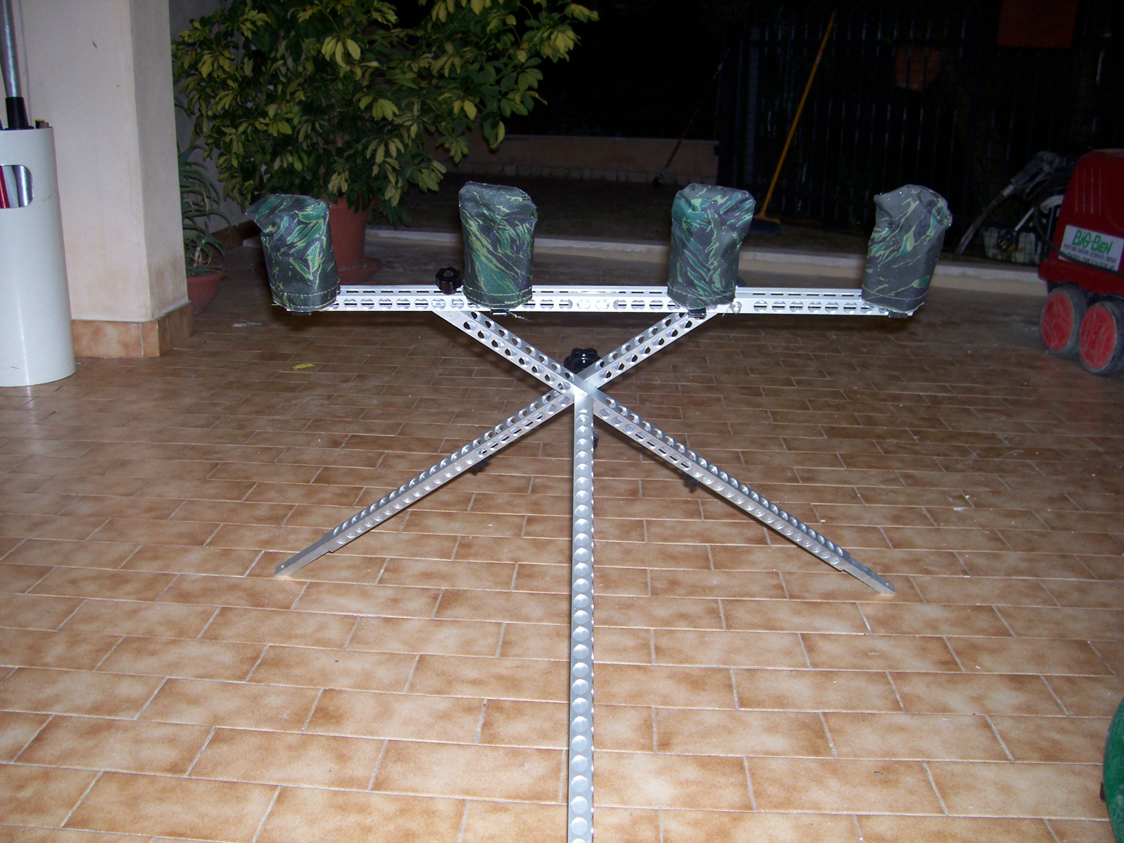 Questo pod è stato completamente costruito da un mio amico, è davvero un ottimo oggetto:molto leggero,stabilissimo,completamente in alluminio, estendibile e con le gambe allungabili è provvisto di prolunghe per poter proiettare le canne verso il celo!!Inoltre è davvero molto versatile e solido dopo anni ed anni di pesca si è rivelato a l'altezza di ogni situazione anche su terreni scomodi e sconnessi o pescando con la frizione dei mulinelli serrata.