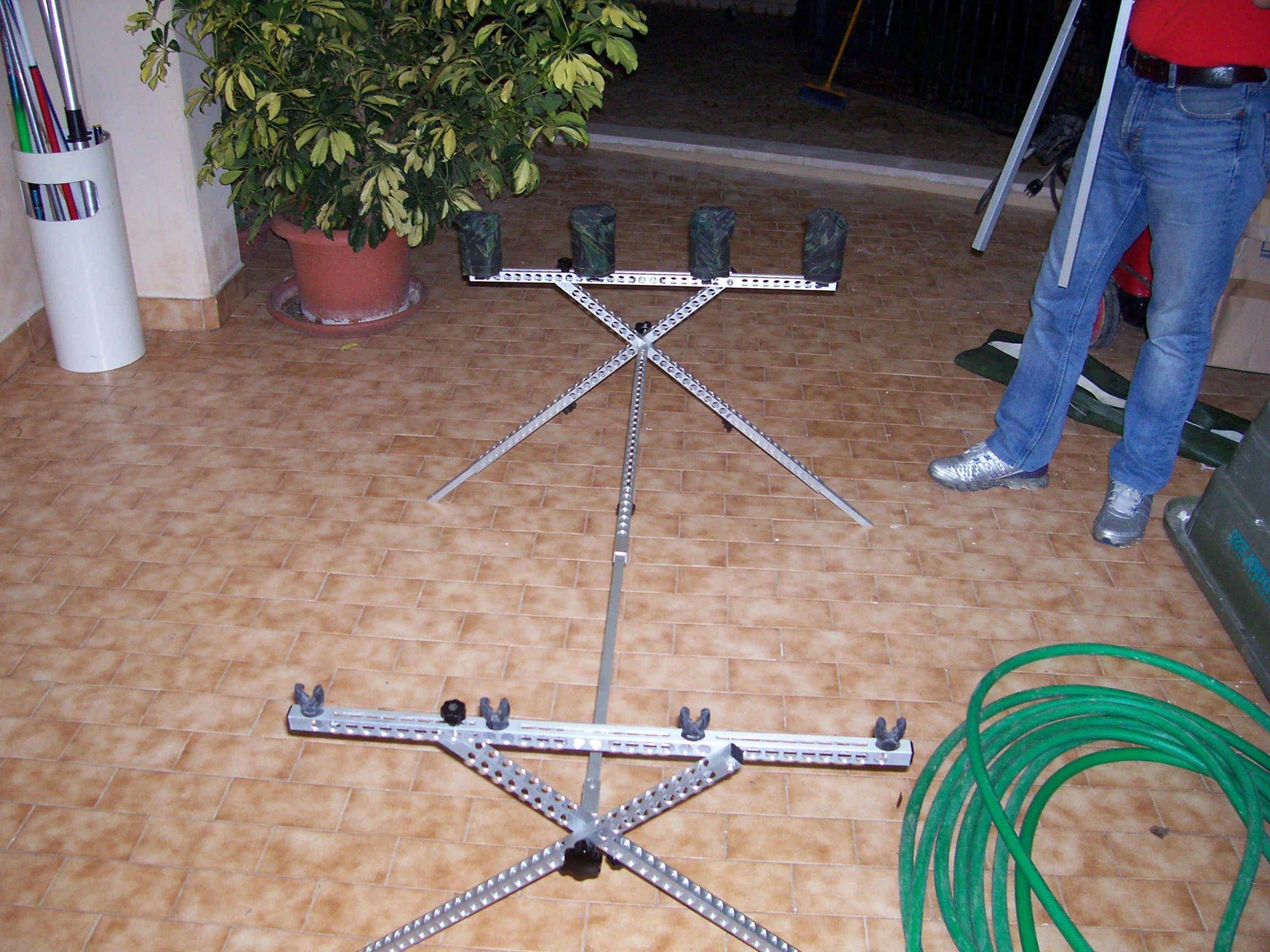 Il Rod Pod è composto da tre pezzi: la barra centrale a cui si vanno ad avvitare i 2 pezzi composti da buzz bar e gambe .Molto ingegnoso è il sistema che unisce buz bar e gambe, che permette di poter allargare o ristringe le gambe a piacimento e di poter montare il pod in pochi secondi inoltre i buz bar sono provvisti di due livelle!Il modello in foto è per 4 canne ma ne sta progettando uno da 3!