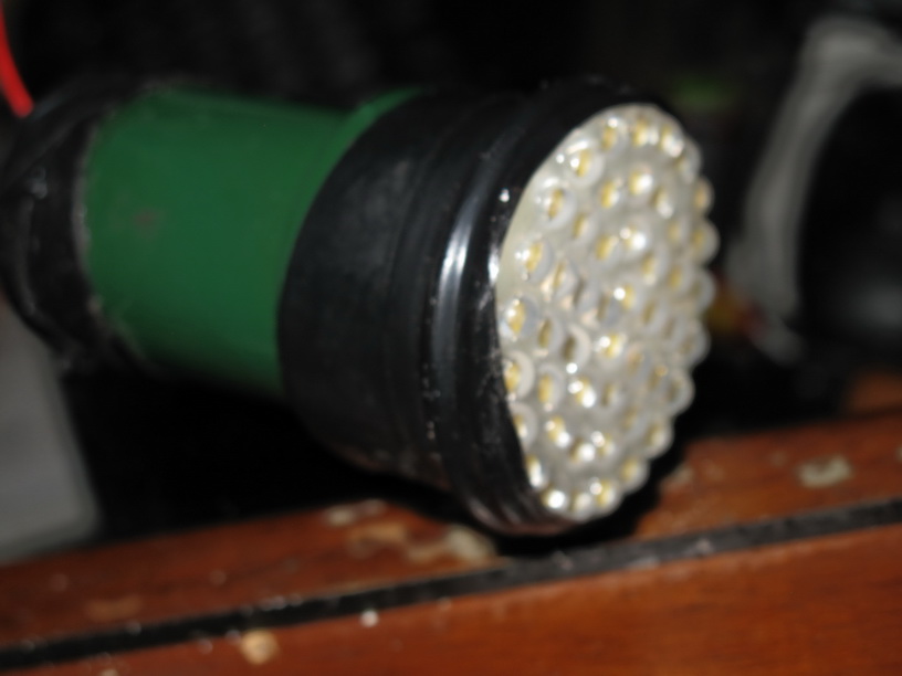 altra soluzione più semplice, che utlizzo per illuminare il campo davanti alla tenda o dove io e cimice abbiamo bisogno di luce, tipo barbeque hahahaha, (quindi è sempre accesa), con lo stesso tipo di lampada e batterie, la copertura dell'area dipende da quanto in alto la fissate, a 2 metri d'altezza copre circa un'area di 5 X 5 metri