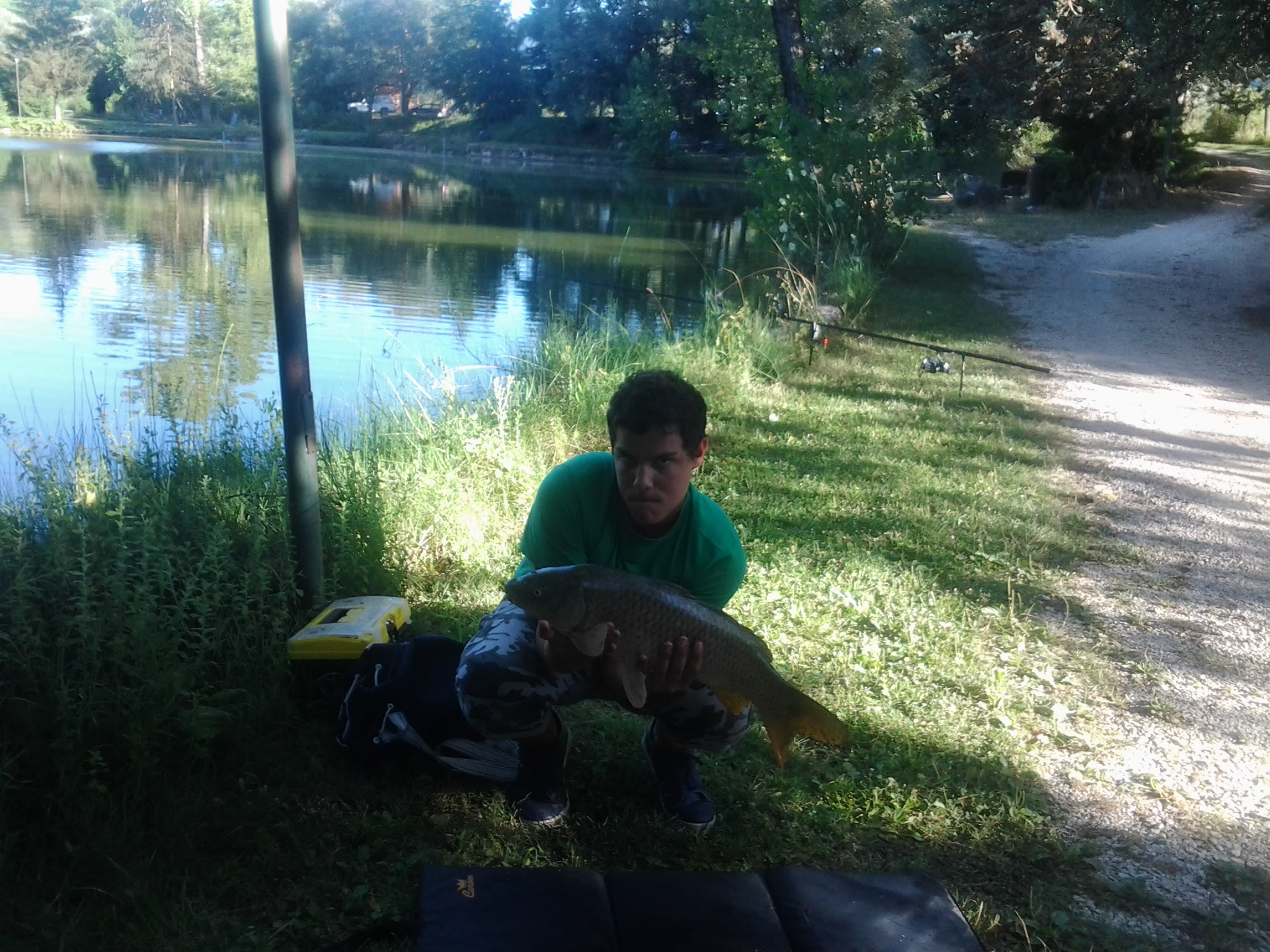 Si parte il 30 luglio pomeriggio alle 16:00 . arriviamo al laghetto per le 16:10 appena arrivato cominciai subito a montare le canne e in poco più di 10 minuti ero già in pesca . mi posizionai in un angolo del laghetto all'ombra e con quel caldo non potevo chiedere di meglio , dopo solo 30 minuti che avevo calato le canne una partenza mi fa sobbalzare dalla sedia corro al picchetto ferro e sento una carpa veloce e senza nessuna intenzione di fermarsi dopo pochi minuti di combattimento la porto a riva.