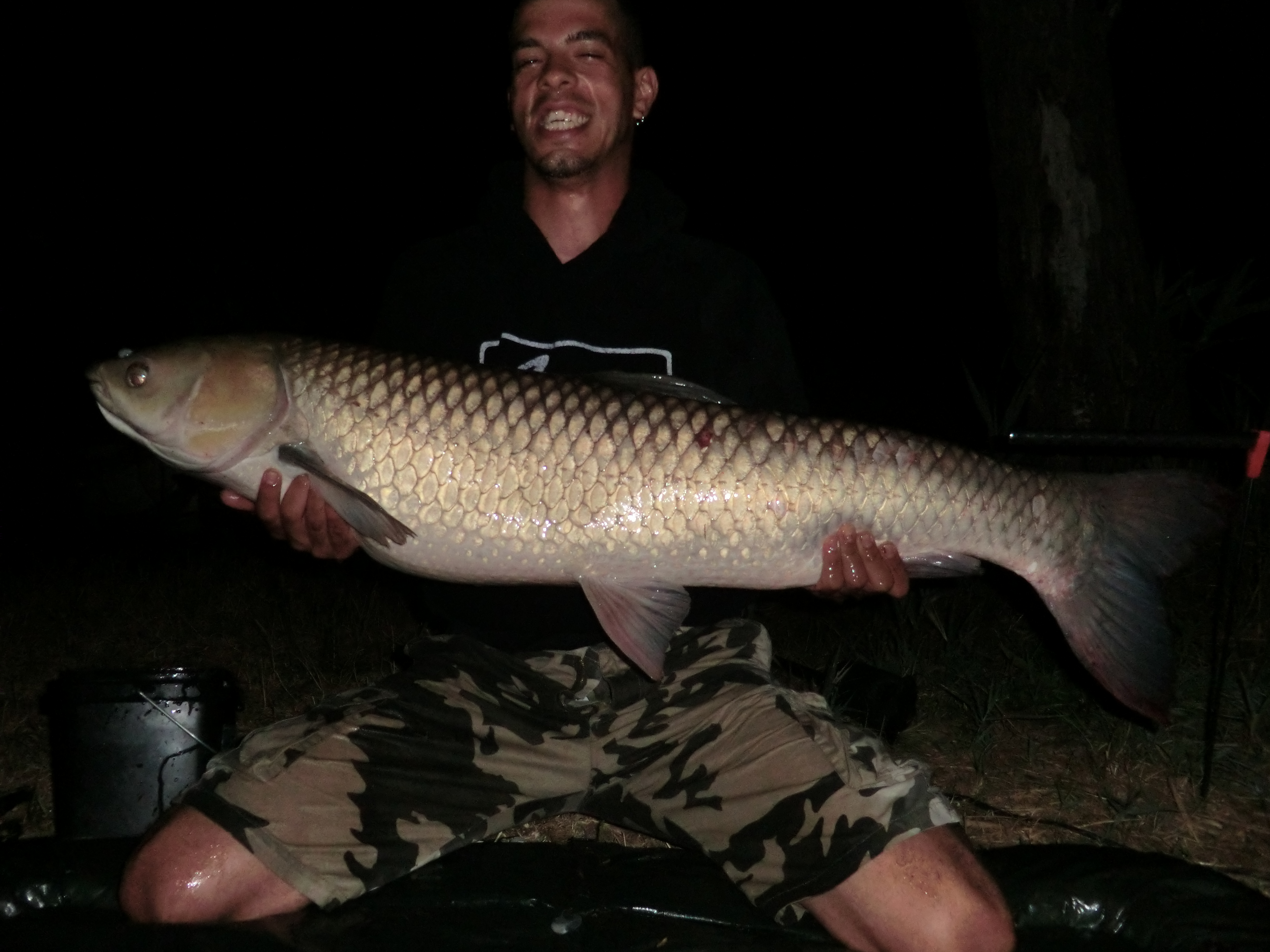 Volevo condividere con voi l'emozione di una notte di luna piena, luminosa, tanto da vederci senza luce artificiale, serena e silenziosa, ma che proprio una luce di color verde (segnalatore + swinger) squarciò ululando una fragorosa partenza, alla quale susseguì una lotta violenta durata 45min. contati dal mio orologio, nella quale venivo sopraffatto continuamente, da qualcosa che sembrasse non voler mostrarsi alla Luna ed a me, finchè, nel sottoriva vidi l'Agrento vivo di cui era dipinta la Fiera....giunti allo stremo (di entrambi), nel mentre era dentro alla rete del Guado, con ultimo disperato tentativo di riprendersi la libertà, lo portò in tutte le direzioni per un tempo di oltre 20 sec. facendomi arrivare a scoppiare il cuore.....per poi arrendersi al vincitore e farsi pesare e fotografare...Lago della bilancia si fermò a 19,86Kg! Una sessione stupenda!