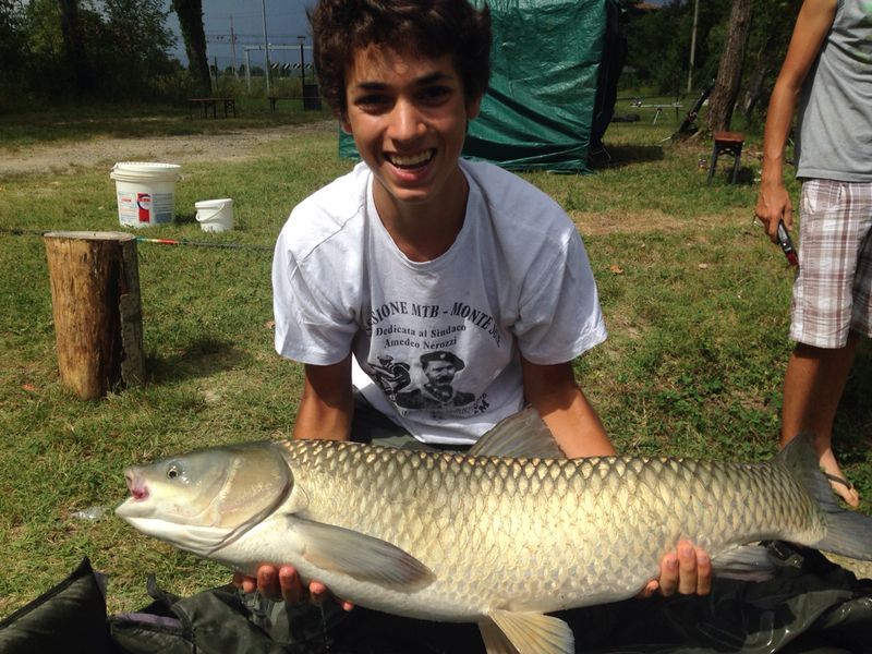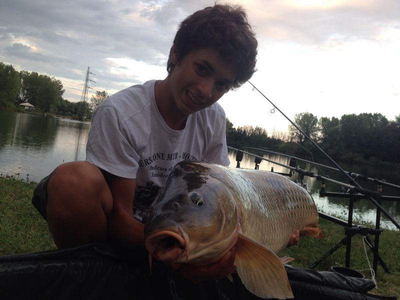 Durante la notte verso le 3 mi parte la canna sottoriva dove c'era innescato una spugnetta,una tiger e un chicco di mais, visto che é stata la mia prima notturna, quando sono uscito avevo dimenticato di svegliare i miei amici per aiutarmi e mi sono dimenticato le ciabatte e la torcia da testa( per fortuna ci sono dei lampioni intorno al lago), peró nonostante tutto sono riuscito a guadinare la carpa e metterla sul materassino :oops: . Alla mattina verso le 9 inizia a piovere forte, dopo un`ora inizia a rallentare e arriva subito una carpa e poi rinizia a piovere forte fino all`una subito dopo che ha smesso di piovere arriva il mio nuovo record personale una regina di quasi 14 kg nel pomeriggio arriva un altra carpa e poi termina verso le 8 la mia sessione. :cry: