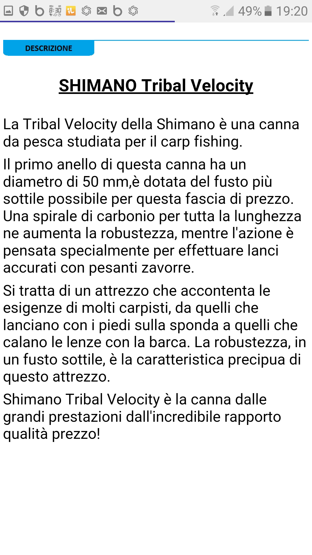 Alivio e buona per iniziare niente da dire non ha il blank di 60 tone in autoclave come la Velociti nemeno il rinforzo esterno in carbonio 3k e un po mollacciona pero e economica,Tribal Velociti era il top qualche anno fa ,adesso Simano ha altri modelli nuovi ,tx9,xs1 intensiti ,pero ancora non sonno paragonabili sia nel lancio che maneggevolezza a Velociti e costano molto molto di piu tipo 350 euro luna,nel 2017 gli grandi campioni da Casting usano la Velociti nelle gare da lancio,HO DETTO TUTTO.