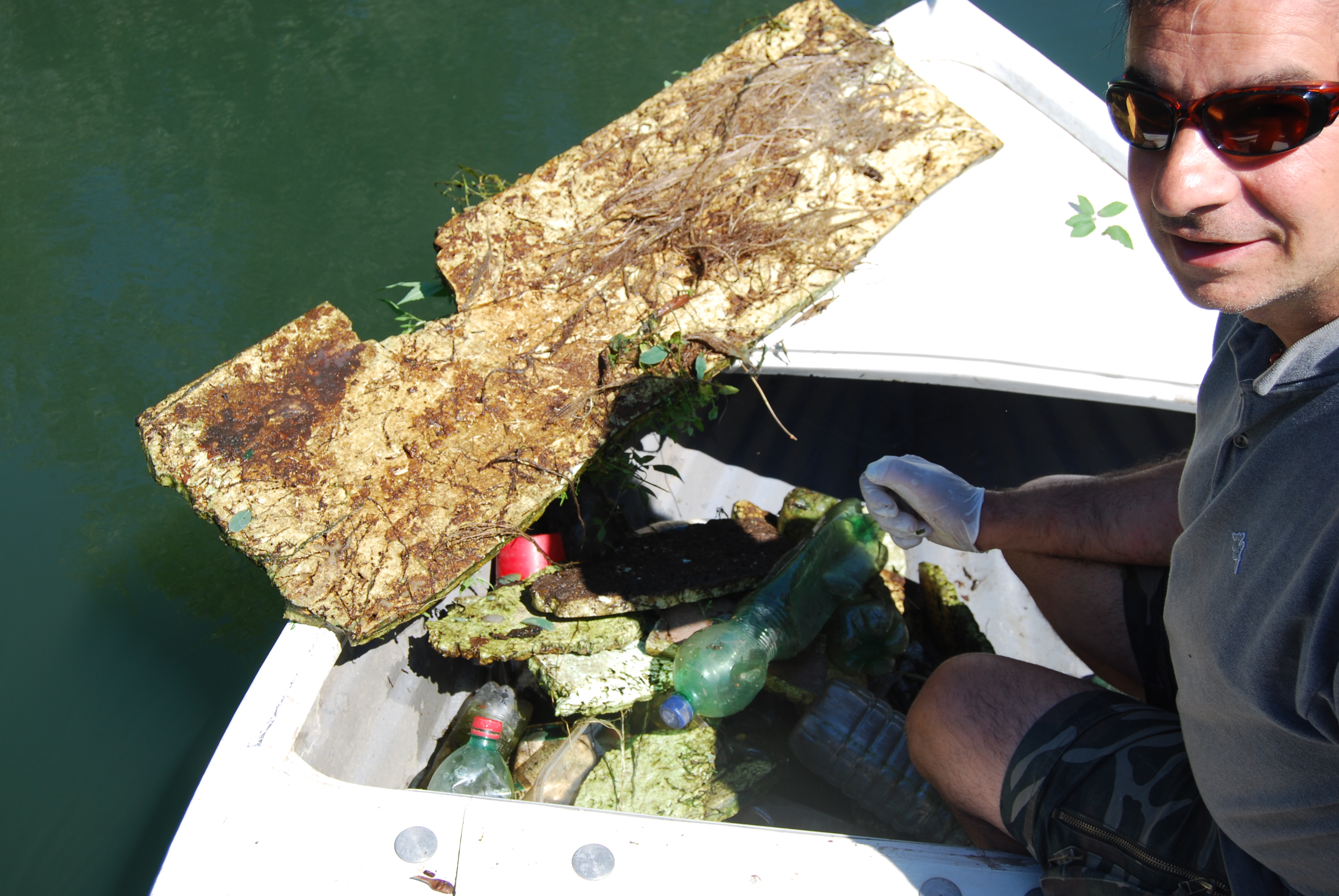 Dapprima lungo le sponde, poi in barca a battere le rive. Abbiamo raccolto 4 sacchi grandi pieni di bottiglie di plastica e vetro, lattine, un'incredibile quantità di polistirolo.