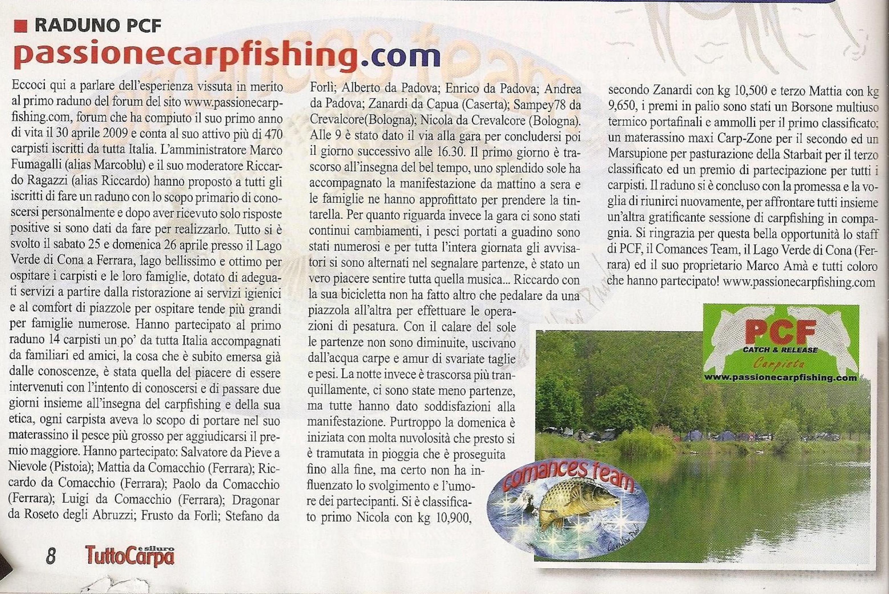 Invio un particolare ringraziamento alla rivista TuttoCarpa e siluro che ha pubblicato un articolo del nostro 1° RADUNO PCF!
