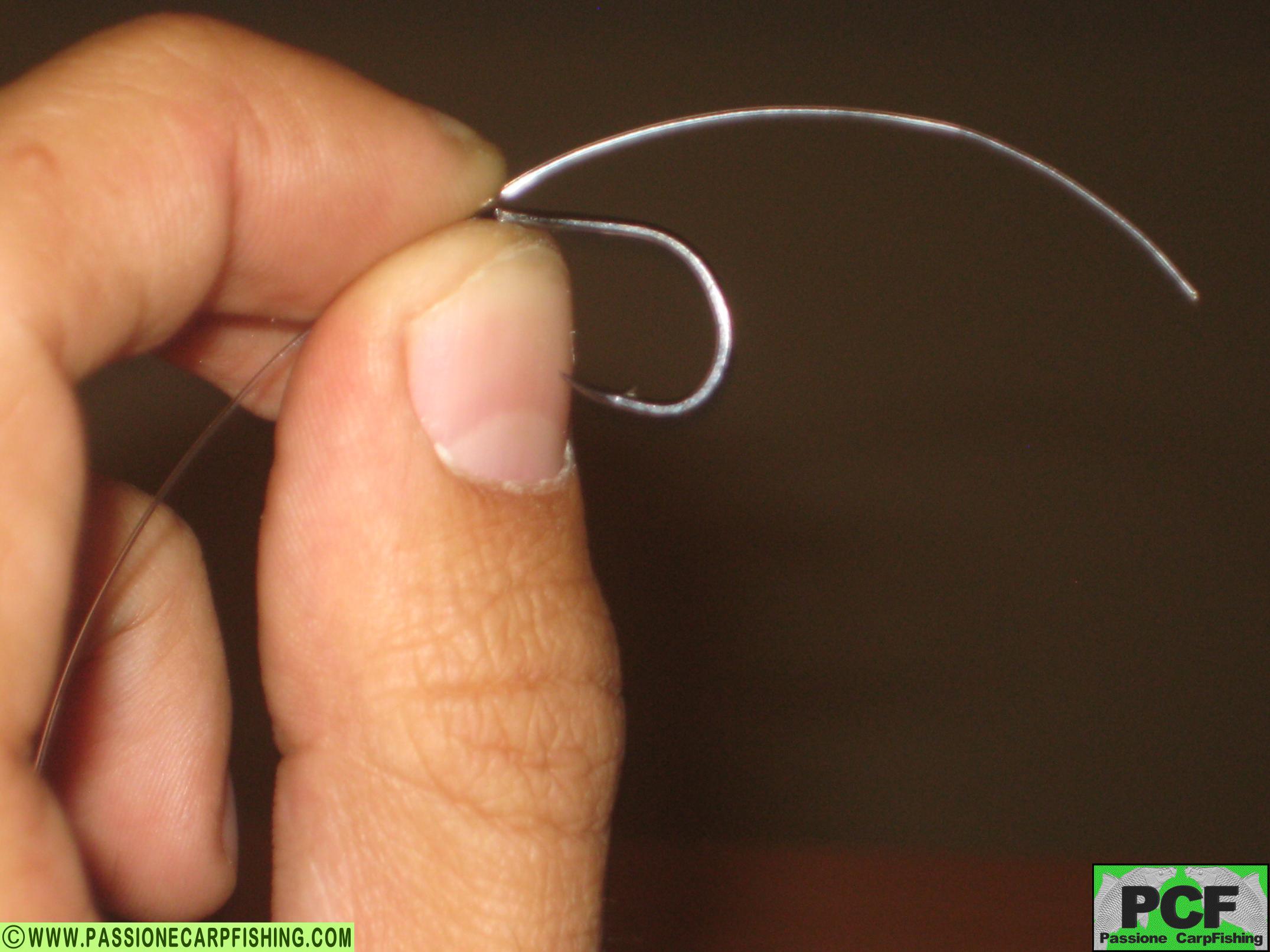 • Tubicino di silicone 1,5mm di diametro. Tagliare uno spezzone di fluorocarbon di 25 cm, farlo passare dall’esterno dell’occhiello dell’amo fino a fare avanzare 3 cm circa. Fare un “senza nodo” facendo 10 spire circa, quindi serrarlo. Fare passsare, prima dal filo quindi dalla punta dell’amo un pezzettino di 2/3 mm di tubicino di silicone (attenzione, il tubicino deve essere abbastanza grande da passare dalla punta dell’amo senza rompersi ma non deve essere cosi grande da scorrere sull’amo). Successivamente inserire l’anellino di acciaio. Infilare lo spezzone di fluorocarbon “avanzato” dall’esterno dell’occhiello e bruciarlo fino a formare una pallina che non permetterà al filo di uscire dall’occhiello. Il D-rig è un tipo di amo molto efficace per gli inneschi pop-up, forse il più utilizzato dai carpisti. Per inneschi pop-up, ricordiamoci di inserire sul fluorocarbon vicino alla base dell’amo, un piombino o della pasta in tungsteno di adeguata grammatura.