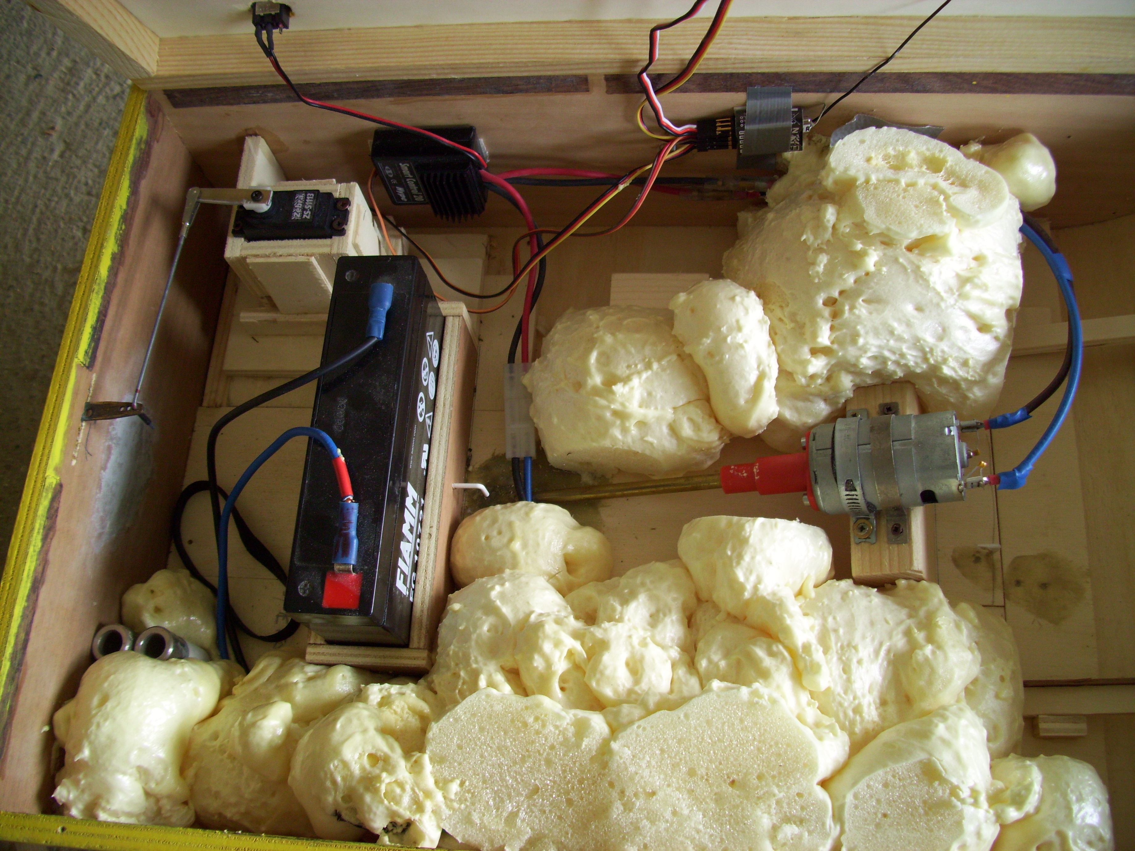 Il secondo è un pò piu semplice nella costruzione. Il cuore del barchino è sempre in legno rivestito di vetroresina e poi verniciato, ma la parte inferiore è fatta con i classici tubi arancioni da edilizia e poi verniciati. Ha solamente una vasca anteriore che porta 1kg di boilies e l'elica rivestita con rete metallica. A differenza del primo ha più autonomia perche funziona con 2 batterie da 6v unite insieme.