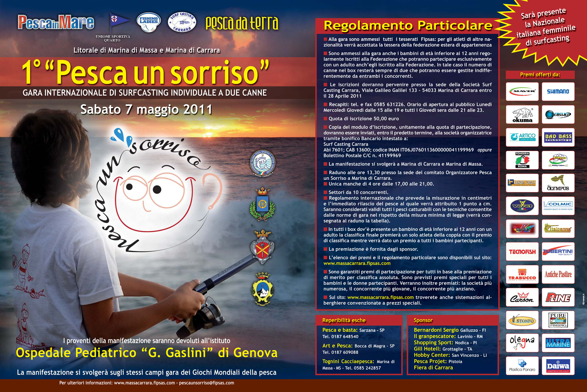 A Marina di Carrara si è disputato il primo trofeo internazionale di surfcasting Pesca un Sorriso, organizzato da Fishing Ladies, Pesca da terra, Pesca in Mare, Unione Sportiva Quarto, Surfcasting Carrara e FIPSAS Massa Carrara, i cui proventi sono stati donati all’Ospedale Pediatrico Gaslini di Genova. Una grande iniziativa che ha visto coinvolte tutte le aziende del settore che hanno donato premi alla manifestazione. La gara si è svolta sulle spiagge di Marina di Massa e Marina di Carrara e ha visto la partecipazione di 111 concorrenti, compreso bambini di età inferiore ai 12 anni e molte donne. Una bella giornata che è iniziata con il raduno presso la sede del Surfcasting Carrara e che è proseguita con la pescata che si è rivelata foriera di belle catture. Tutto il pesce è stato liberato e la classifica è stata fatta a centimetri misurando le prede che sono state subito rilasciate. La manifestazione si è conclusa con la premiazione di tutti i concorrenti secondo la classifica generale vinta da Valter Conforti Del SPS Casting Blu Marlin Pisa con 298 cm seguito da Massimiliano Ferraro dell’Unione Sportiva Quarto ASD con 207 cm e da Roberto Matteucci dell’ADS Casting Pegaso con 167 cm. Hanno ricevuto premi speciali tutti i bambini, le donne, gli stranieri, il concorrente più giovane, quello meno giovane e la società più numerosa. Un grazie particolare ad Artico, Bad Bass, Carson, Colmic, Fonderia Roma, Filpesca, Shimano, Leader Pesca, Olympus, P-Line, Stonfo, Veret, Antiche Pasture, Maver, Olegna, Fassa, Italcanna, Tecnofish, Plastica Panaro, Tubertini, Trabucco, Ultramarine, Okuma, Pure Fishing, Pesca e Basta, Bernardoni Sport, Il granpescatore, Hotel Alba, Hotel Gill, Shopping Sport, Blu Shark, Massa Fiere, Arte Pesca, Tognini Sport per i premi che hanno donato. A Stefano Sarti, Daniela Ferrando, Massimo Ferrara, Massimiliano Giacich, Alfonso Vastano, Paola Cingolati e tutti i volontari un ringraziamento particolare per l’impegno e la buona riuscita della manifestazione.