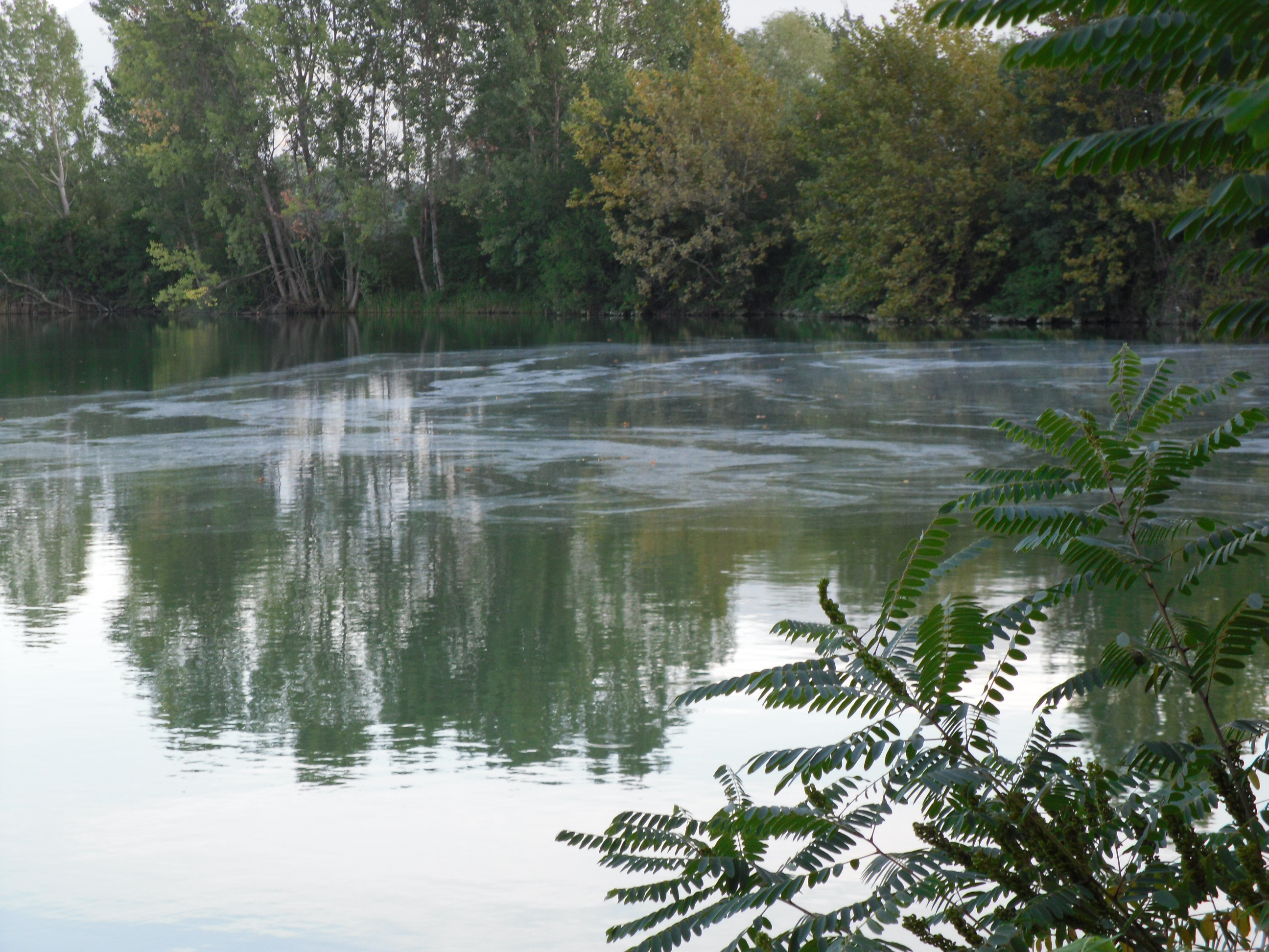- per tutto il giorno nell'angolo nord-est a 100 metri da me ha galleggiato tranquilla una bella chiazza di solfato o roba del genere, che col vento si stiracchiava come un'ameba ma non scompariva, vedi foto. Siamo in piena riserva naturale con tanto di decreti di protezione ma il posto appartiene al viticoltore Bersi Serrlini e sfido chi ha il coraggio di andare a fare rimostranze... roba da matti