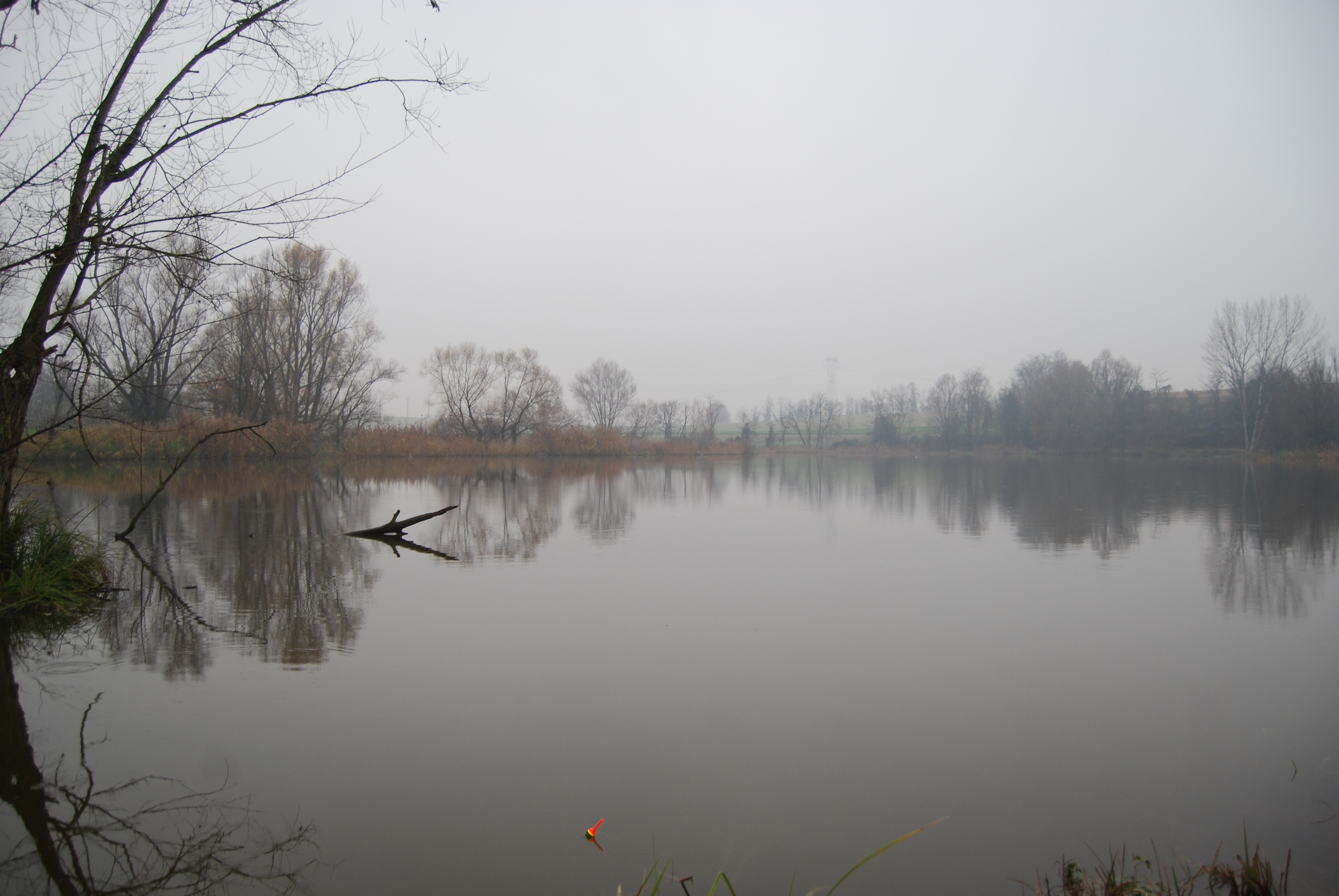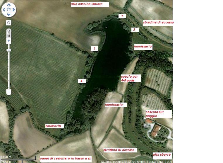 Nel lago entra da sud un immissario abbastanza copioso, almeno in questi giorni di pioggia. L'acqua è abbastanza torbida ed il colore dà l'idea di un fondo fangoso, anche se guardando bene vicino a riva ci sono delle pietre per cui il fondo potrebbe essere misto fango-ghiaia. Anche qui zero cartelli. La sponda subito oltre l'immissario è comodissima, piana, senza alberi per almeno 50 metri fino ad un canneto che si prolunga nell'acqua, i campi coltivati arrivano a un metro dall'acqua; qui ci stanno tranquilli 4 o 5 pods. La riva di fronte è tutta a canneto ma ho creduto di intravvedere un paio di postazioni (3 e 4). Ho passato un'oretta a misurare il fondo: si va dai 2,5 a ca. 20 metri fuori dall'immissario ai 3 in mezzo, ma la profondità cresce leggermente andando verso la sponda nord. Nel punto più profondo potrebbero esserci 4 metri o poco più. A 10 metri da riva il fondo va da poco più di 1,5 a ca. 2 spostandosi da sud a nord, poi fa un piccolo gradino. Non ho sentito ostacoli ma sondando senza amo è difficile avvertirli; nemmeno alghe ma data la stagione pare scontato.