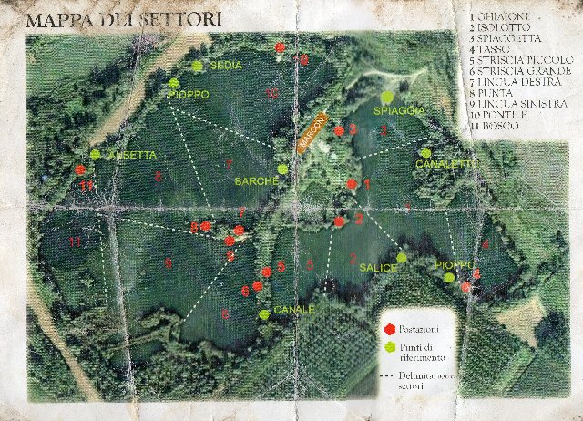 altre info sul lago. come potete vedere dalla cartina messa a disposizione da Diego, il lago si divide in due comunemente chiamati piccolo e grande. Il piccolo ha una profondità max di 8 ma la media e 2-4 m. il lago grande ha una profondità max di 12 m presenta molte secche alcune delle quali visibili solo con l'eco poichè situate in punti di profondità costante sui 5 ed 8 m. In prevalenza e ghiaioso ed anche senza eco ci si può pescare con l'uso della barca a vista...e molte volte si prende di più a vista che con l'eco. Sotto gli alberi è buono ed in genere bisogna pasturare poco poichè le carpe sono molto sospettose, sia che usiate granaglie sia boilies. Altro fattore importante che mi ha dato sempre successo, uscire poco con la barca e non come fà qualcuno...ho visto gente pescare in 3 dalla stessa posta con 4 canne a testa ed uscire 2 volte al giorno, per portare le 4 canne con relativa pastura! se vi mettete con carta e penna e contate i viaggi del singolo che porta 4 canne al mattino e poi le riporta tutte 4 per la notte e lo moltiplicate per il numero dei pescatori e cioè per 3...vi renderete conto perchè nessuno prenderà nulla! se poi calcolate il peso della pastura che il singolo usa per tutti i viaggi e per i suoi 3 compagni capirete quanti soldi stanno buttando per non prendere nulla. Pasturate poco, inneschi semplici e calati precisamente e tanta convinzione...se siete furbi calate quando folaghe e svssi se nevanno nel nido! Così facendo la pastura resterà dove la buttate assieme all'innesco e se non ci sarà più non sarà colpa degli uccelli...ma perchè vi starà per partire la canna. Di notte silenzio e piuttosto che uscire in barca per riposizionare una lenza, lanciate...in questo posto un esca fuori pastura potrebbe funzionare senza spaventare i pesci che avete in pastura.