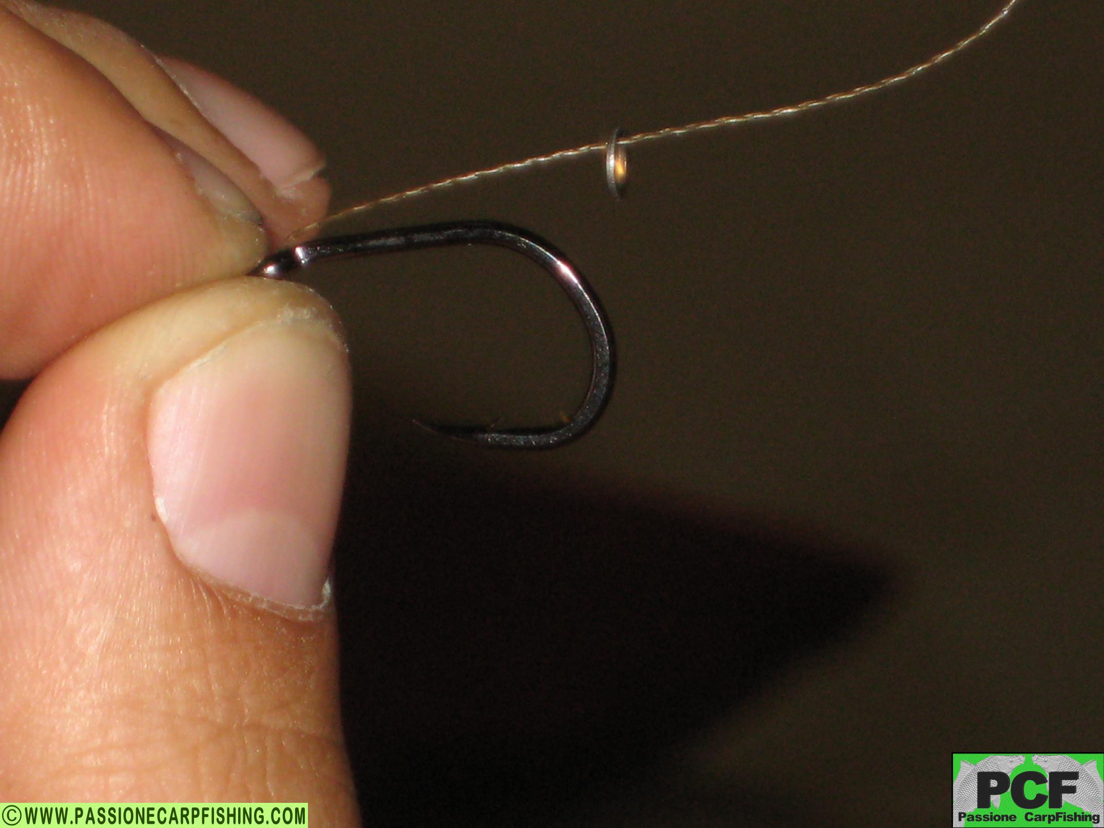 5) Inserire il tubicino di silicone o termo-restringente. Se si usa il tubo termo-restringente non utilizzare la fiamma dell’accendino per farlo stringere (si rischia di rovinare il filo) ma vapore o acqua bollente. Anche questo terminale è di semplice realizzazione. Per inneschi pop-up, ricordiamoci di inserire sul trecciato vicino alla base dell’amo, un piombino o della pasta in tungsteno di adeguata grammatura.
