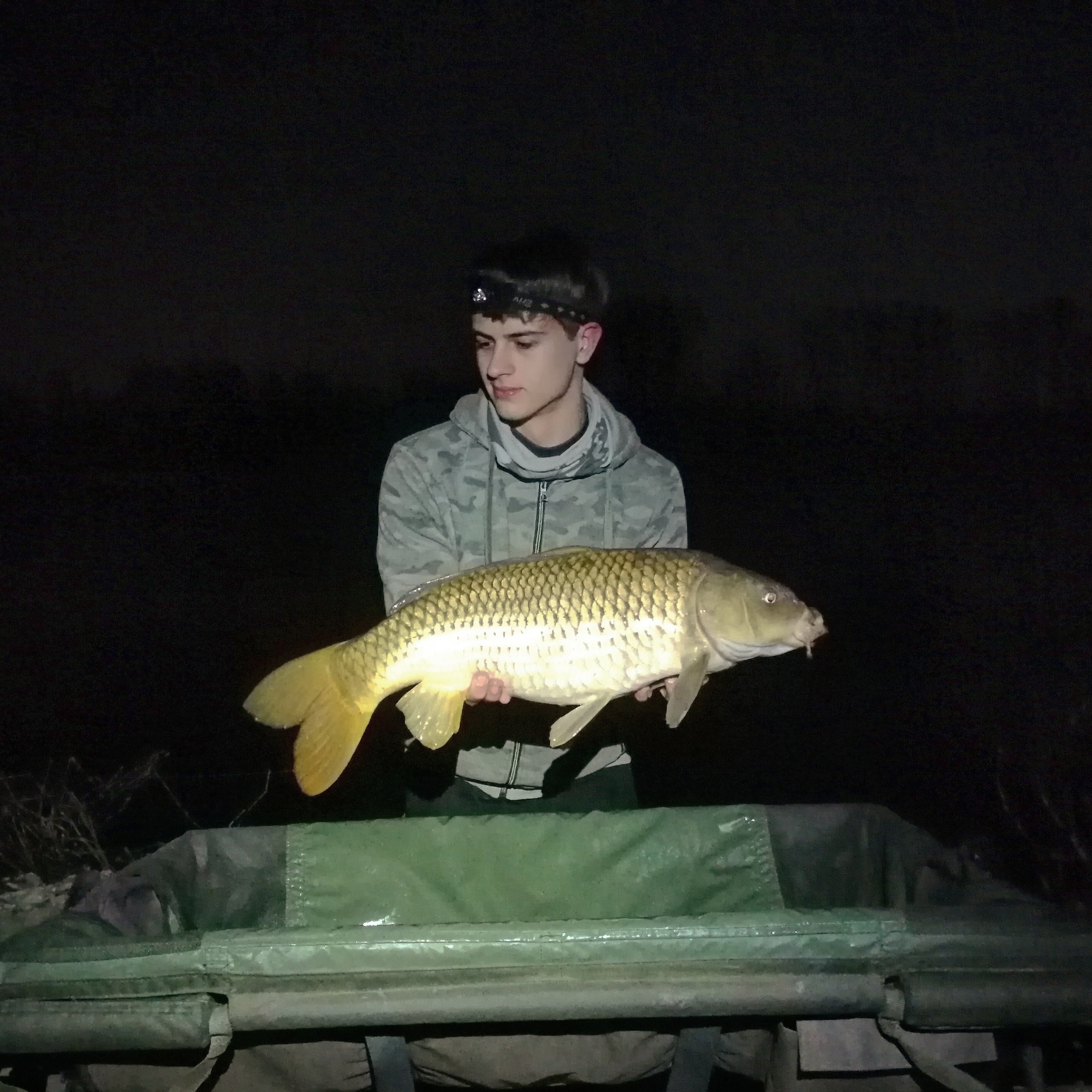 alle 23.40, mentre stavo mettendo via il computer per andare a dormire, partenza a cannone sulla canna gialla, quella nel giro d'acqua a 100 metri dalla tenda. urlo a mio papà che ormai dormiva "carpa carpa carpa carpa", infilo le crocs, metto gli occhiali, telefono in tasca e luce da testa. corro come se non ci fosse un domani, intanto il segnalatore sta ancora suonando all'impazzata, finalmente dopo 40 lunghissimi secondi arrivo alla canna, ferro. Tira, è grossa. è stato il combattimento piu lungo che ho fatto, anche perche ho faticato molto a metterla nel guadino dato che la sponda era tutta tipo sabbie mobili (il pomeriggio ho dovuto lanciare dell argilla fino a formare un posto sul quale scendere senza sprofondare) e guadinare il pesce è stato difficile perché c'era poco fondo e la carpa dritta quasi non ci passava, inoltre la corrente aumentava tantissimo perche appunto c'era meno fondo e quindi fa "effetto ruscello". ore 23.50 finalmente entra nel guadino, la slamo e la metto in sacca. al mattino faccio le foto con la luce: torno a letto carico di adrenalina e non dormo finche all 1.30 in piena notte parte la canna a 2 metri dalla tenda, anche questa a cannone e prende la corrente, in pochi minuti riesco a portarla a guadino dato che non era enorme. foto veloce al buio senza metterla in sacca e subito rilasciata.