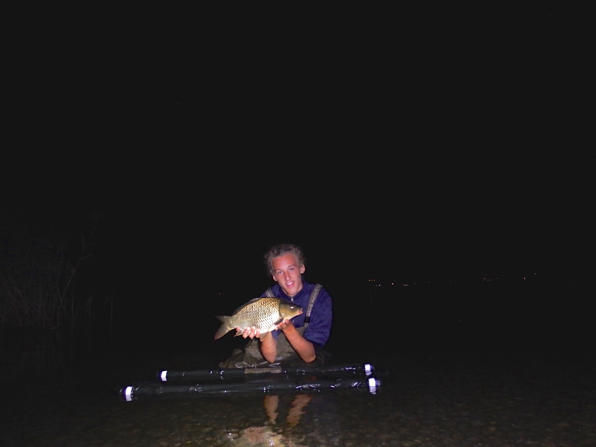Questo è il racconto di una tra le più soddisfacenti e frustranti sessioni della mia vita. In compagnia di Davide, un mio vecchio amico, decidiamo di fare una pescata assieme di una sola notte sul lago di Garda. Non avendo la patente e dovendomi adattare agli orari lavorativi dei miei genitori, mi faccio portare al lago alle 13. Davide arrivava finito di lavorare circa alle 19 ed io sprovvisto di gommone non potevo far nulla se non aspettare il suo arrivo. Dopo un intero pomeriggio passato a preparare i terminali e parlare con i curiosi passanti che facevano mille domande sulla pesca, la fatidica ora arriva!. Do una mano a Davide a montare tutto. Gonfiamo il gommone, mettiamo i waders e lo portiamo in acqua assieme ai due pod. Il lago era piatto, il sole ormai era tramontato e pian piano iniziamo a calare le canne. Mentre stiamo arrivando sul primo mio spot con le torce puntate in acqua notiamo un bel gruppetto di carpe che nuotavano a ridosso di un banco d'alghe affianco al canale di uscita di un porto lì vicino. Non ho dubbi! Nel giro di un quarto d'ora piazzo 2 inneschi uno all'inizio delle alghe e uno alla fine a circa 30 mt di distanza l'un l'altro creando un bel tappeto con circa un paio di chili di palline. La calata è stata di circa 150mt e nel ritorno molto sorpresi notiamo altre carpe a circa 40 mt dai pod, Davide decide quindi di piazzare subito una canna lì, scelta che più tardi si rivelerà vincente. La serata prosegue mangiando una pizza, bevendo una birra e ascoltando le onde del lago che ci arrivavano quasi sotto le brande. Ormai stanchi ci buttiamo a letto e nel bel mezzo del silenzio di mezzanotte : biiiiiiiiiiiiiiiiiiiiiipppppp!! In un secondo balziamo fuori dalla branda, in qualche modo mettiamo i waders e Davide ferra la canna. Era partita proprio quella calata a 40mt!! mentre io corro a prendere il guadino, Davide è nel mezzo del combattimento e fortunatamente la carpa sembrava venire verso di noi abbastanza facilmente. Qualche ripartenza e poi dritta dentro il guadino. Era una piccola ma bellissima reginetta! Prendo la sacca e la sposto a riva, Davide la slama e senza nemmeno fotografarla la lasciamo ritornare nel suo grande lago. Con molta voglia di tornare sulle brande decidiamo di lanciare a mano la canna e ancora più fiduciosi e contenti di prima ci ributtiamo sulle brande. Nelle successive ore si alza un po di vento che inizia ad increspare l'acqua e a portare a riva delle alghe molto collose che si erano staccate dal fondo. Improvvisamente la centralina interrompe i nostri sogni con una partenza violentissima. In un secondo Davide arriva al suo pod ma proprio mentre sta per prendere la canna in mano, la bobina del mulinello si ferma e l'avvisatore smette di suonare: purtroppo la carpa ha rotto in partenza.
