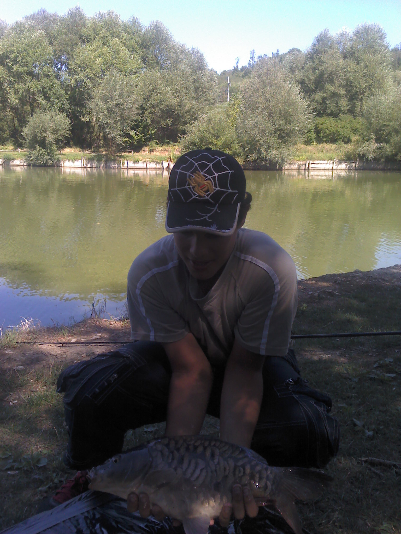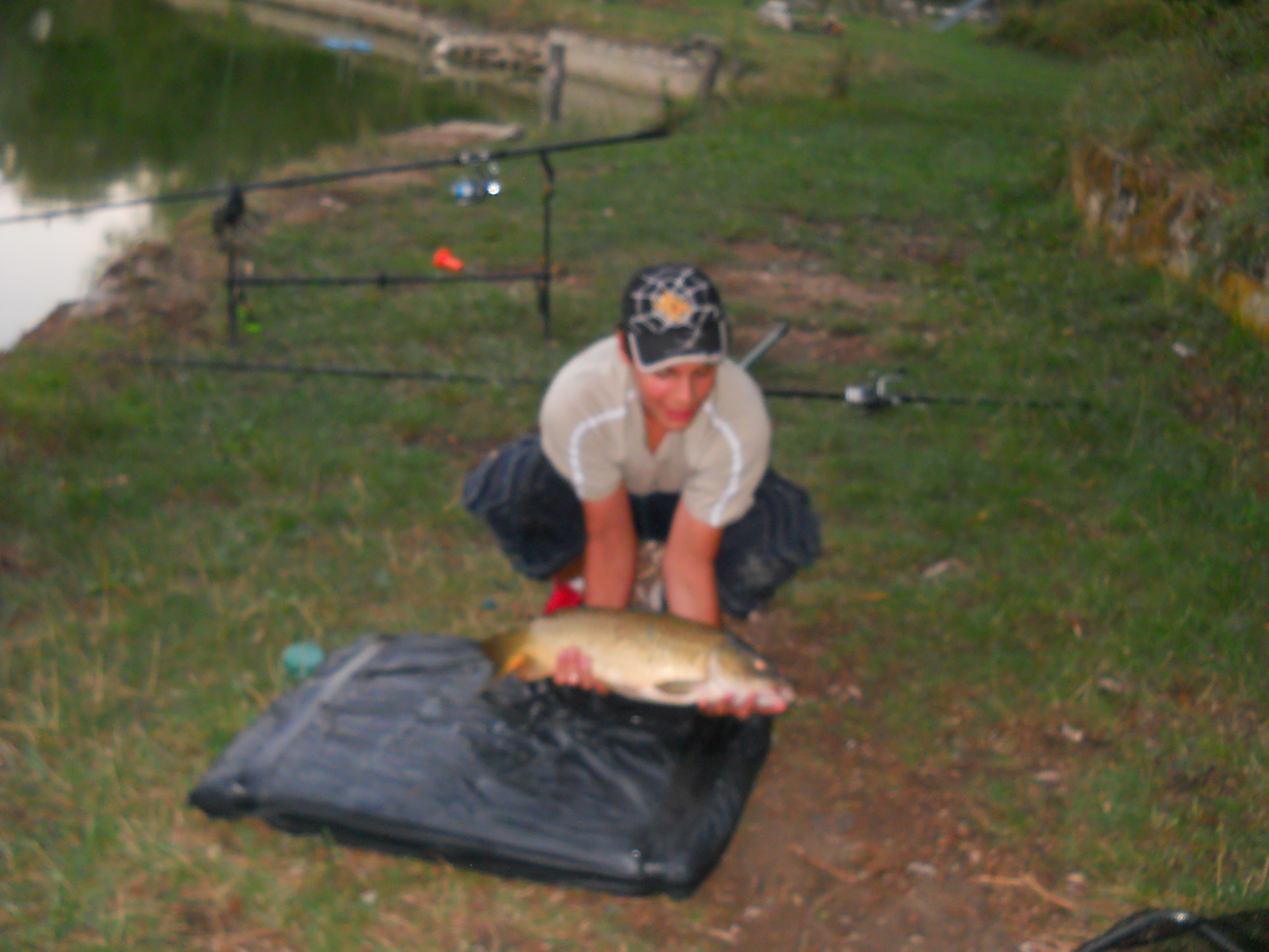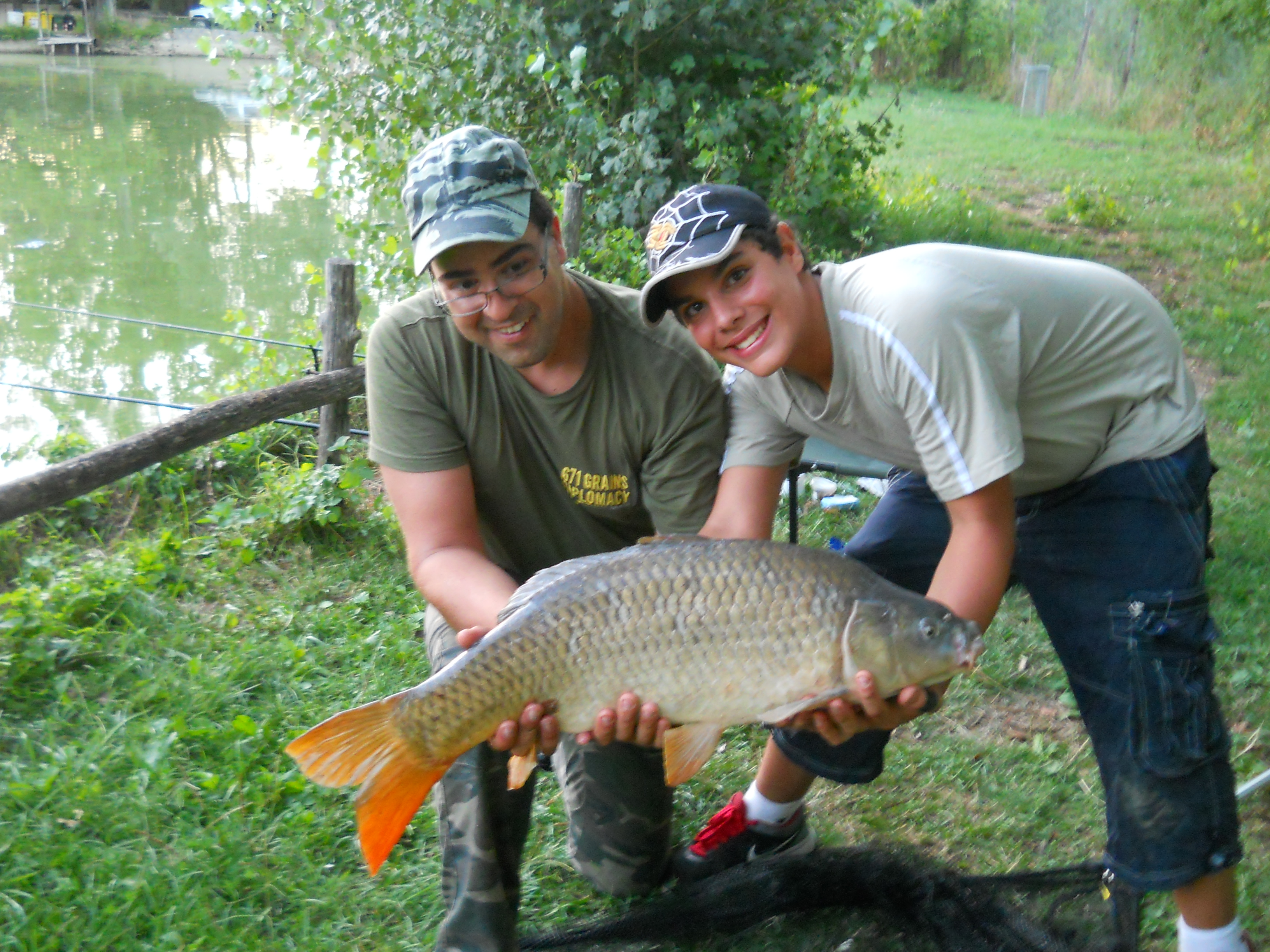 si parte il 28 agosto 2012 mattina alle 7:50. Arriviamo al laghetto per le 8:00 , appena arrivati cominciai subito a montare canne,pod,segnalatori ,swinger ecc ecc.Alle 8:30 sono in pesca , per ammazzare il tempo in attesa di qualche partenza mi misi a pescare alborelle .Passano le ore e si era gia fatta ora di pranzo e mentre mangio sento un bip dal segnalatore di centro mi avvicino al pod ma niente era solo una mangiata .Mio padre torna a casa e io resto al laghetto con degli amici di papà, neanche mezz'ora che mio padre se ne è andato e sento partire la canna di centro velocemente ferro e sento un treno in canna lo faccio stancare e dopo un pò di tempo porto a riva la mia prima carpa a specchi in sette anni che pesco a carpfishing: