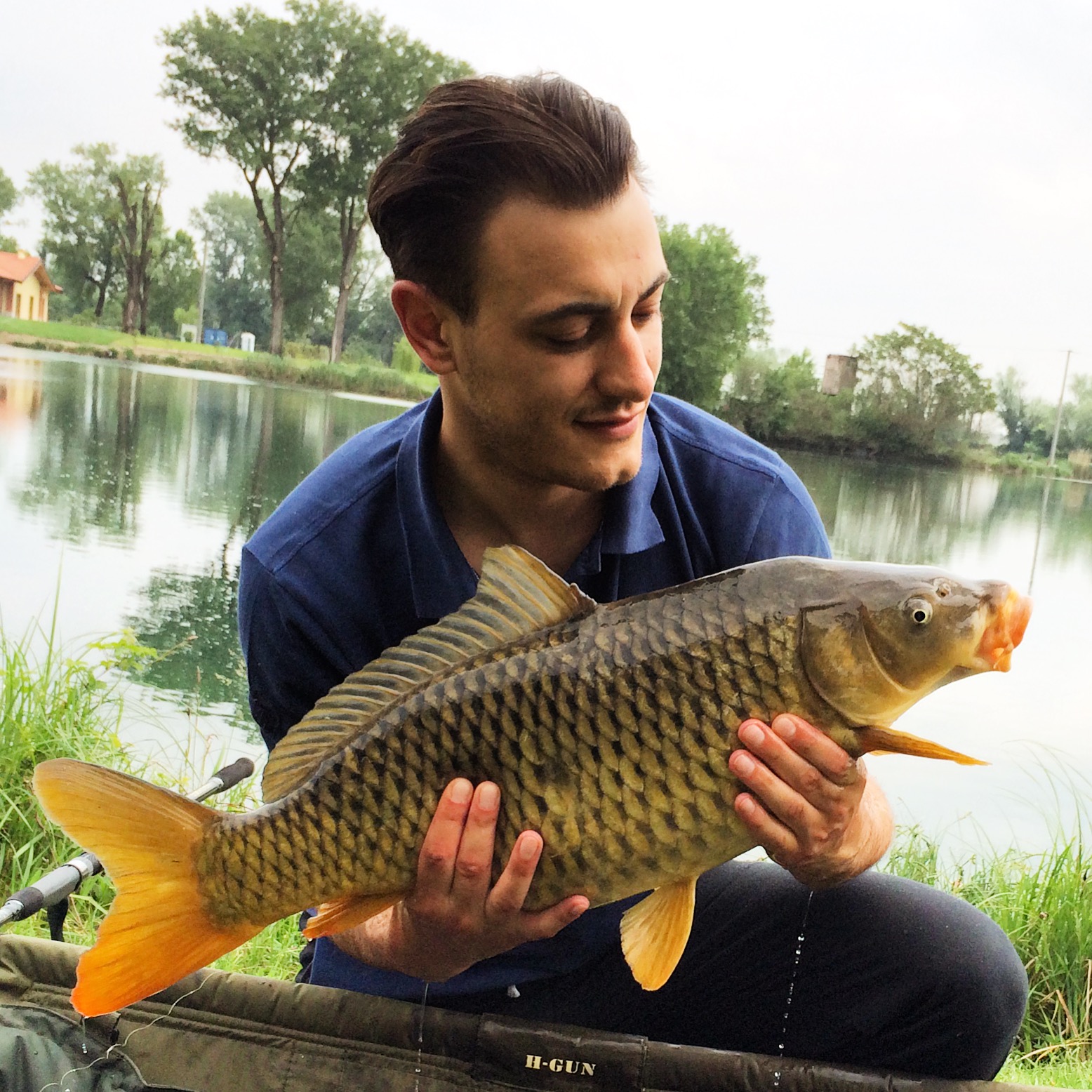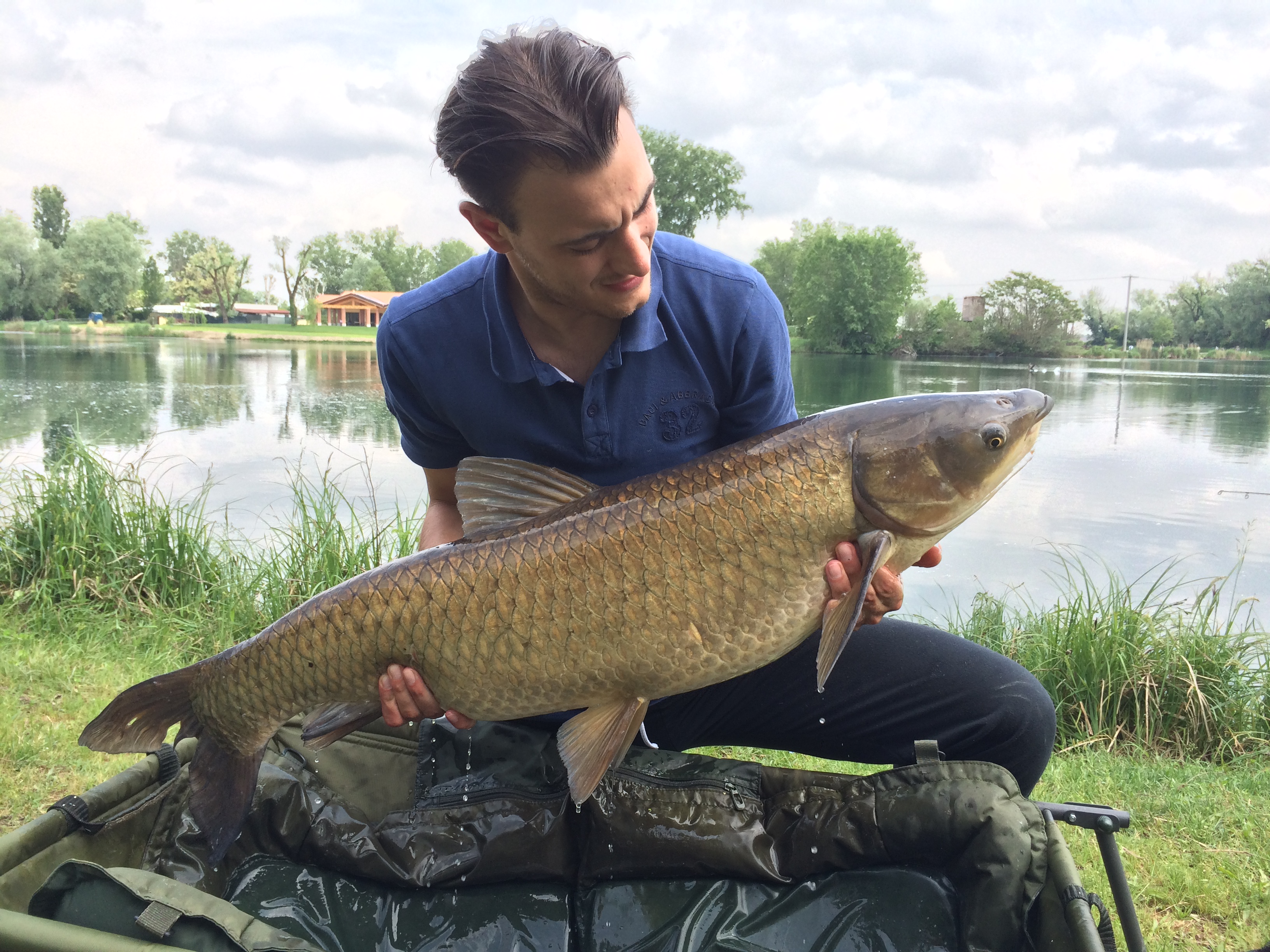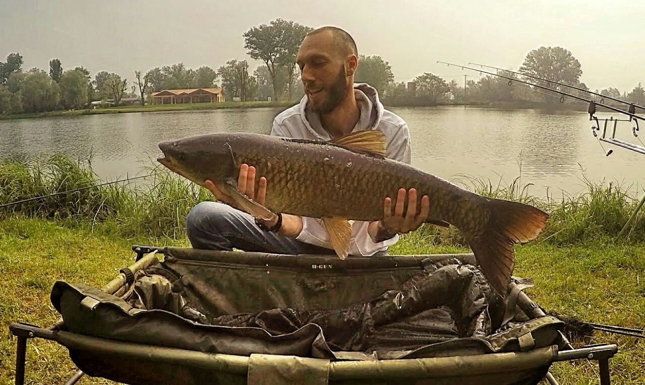 Decido di cambiare assetto e gusto della popup nella canna a centro lago, montando una gusto ananas come il socio, vedendo gli ottimi risultati da lui ottenuti. Mai scelta fu più azzeccata. La canna viene rilanciata sempre a centro lago, la lascio agire e dopo un’oretta vengo fulminato da una partenza lampo. La bobina sembra impazzire, mai visto nulla del genere fino ad ora, do una bella ferrata e sento il pesce in tutto il suo peso. Inizia un combattimento serrato, simile a quello della cattura di Ale. Dopo qualche minuto si intravede da lontano la sagoma, pensavo fosse uno storione ed invece..l’amur viene a far visita anche a me, non vi dico che soddisfazione, finalmente anche io ho un amur a guadino. Una volta salpata a riva mi lascio scappare un urlo di liberazione, è enorme, messa in pesa il pesce fa fermare l’ago della bilancia rasente ai 17kg.