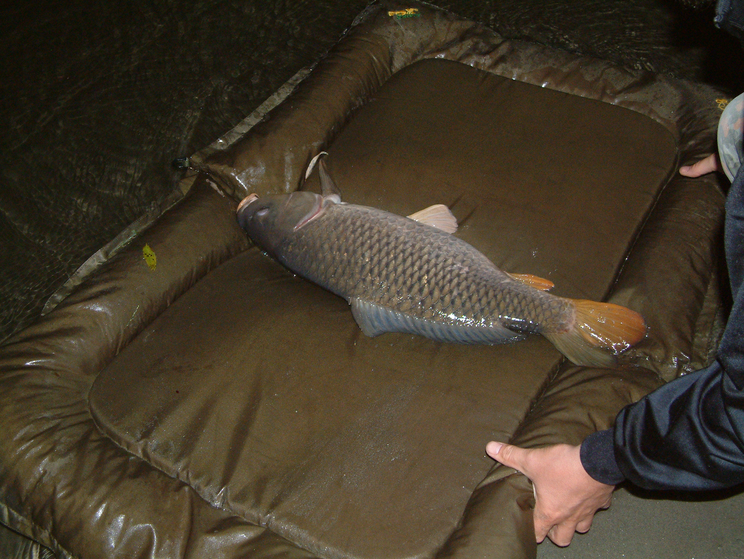 Max prende la mia canna più a sinistra e la tira su, onde evitare il casino ... io continuo a recuperare, e lentamente tiro questo peso verso riva e riesco a vedere la coda ... contento che fosse una carpa continuo lentamente e porto a guadino una regina di ca. 7.5kg ... dico circa perchè nn pensai nemmeno a pesarla ... la regina è caduta su una pallina smezzata, cioè metà aglio/menta e crema di latte chiuse in una calza innescata su un D-rig con aligner ... Marco ancora nn si vede e come dicevo nn ho tirato fuori la bilancia e lentamente porto la carpa sul materassino verso riva, essendo una spiaggetta lenta facevo fatica a rimettera in acqua per riossigenarla, ma dopo pochi movimenti ecco che riparte ... alla mattina, svegliammo Marco a furia di far suonare un suo avvisatore, l'orologio ormai segnava le 10 ...