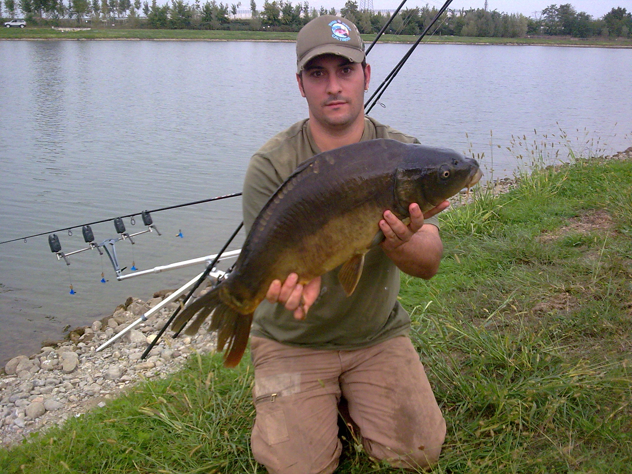 Merda... all'ora con la sinistra tengo la canna che avevo già e con la destra prendo l'altra e ferro deciso... Questa era grossa infatti mi porta via decisa e non riuscendo a dargli frizione mi porta giù la canna. Viene ad aiutarmi il papà di Enrico ( il socio ) che prende la prima canna che ferrai... mentre lui portava a guadino una reginetta di 3,5 kg io continuavo a combattere con la carpona... 15 minuti di combattimento e la vedo...