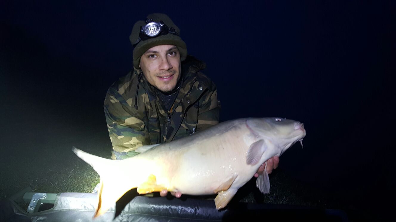Ferro e il pesce non sembra particolarmente combattivo, anzi comincio a pensare che non sia nemmeno una carpa...mentre Mattia mi raggiunge col guadino, punto la torcia in acqua e vedo la sagoma biancastra di una pallida specchi, che stimo sui 7/8 Kg massimo...il combattimento è breve, complice a mio avviso la bassa temperatura dell'acqua e Mattia è rapido e preciso a guadinare.