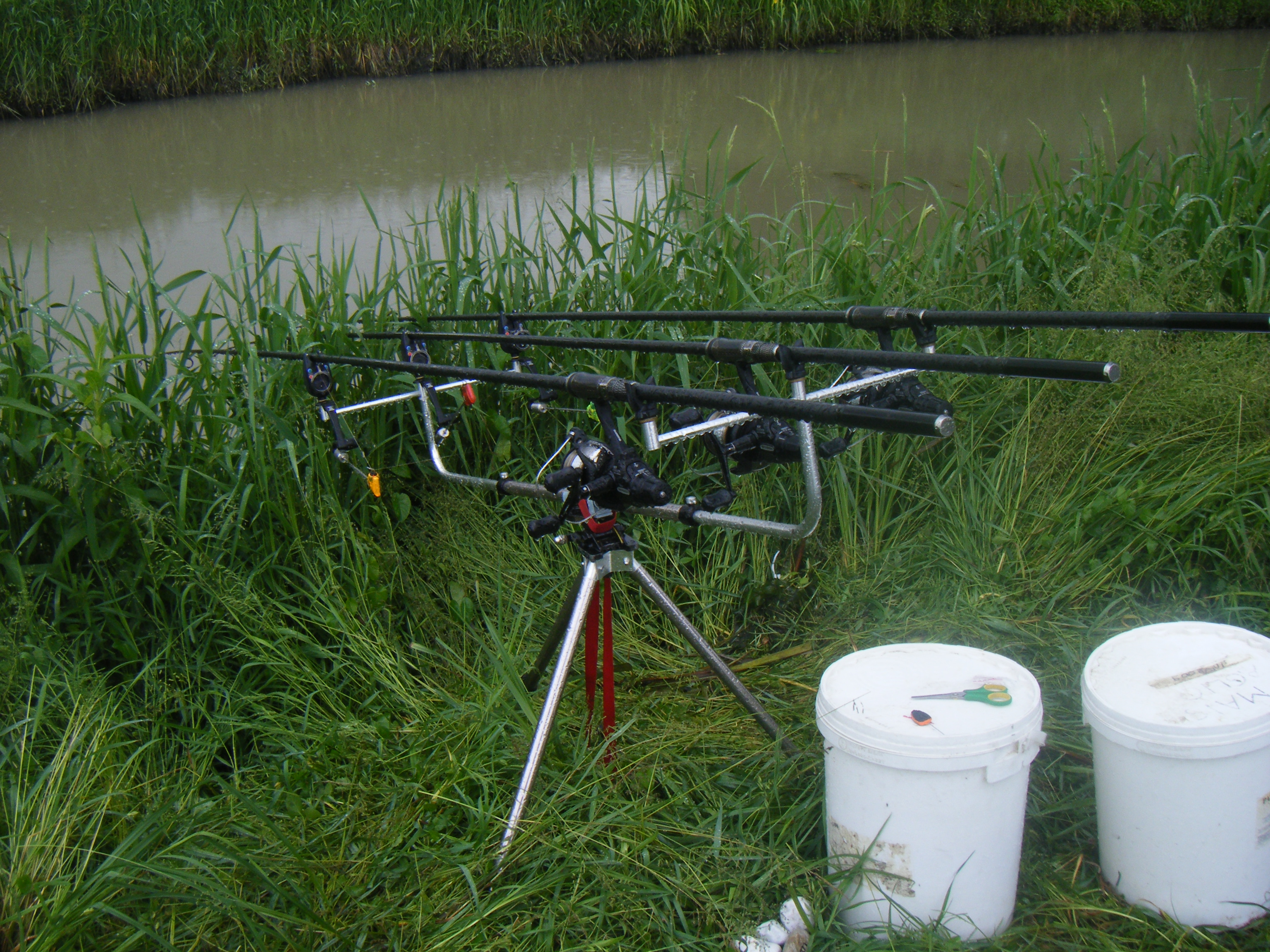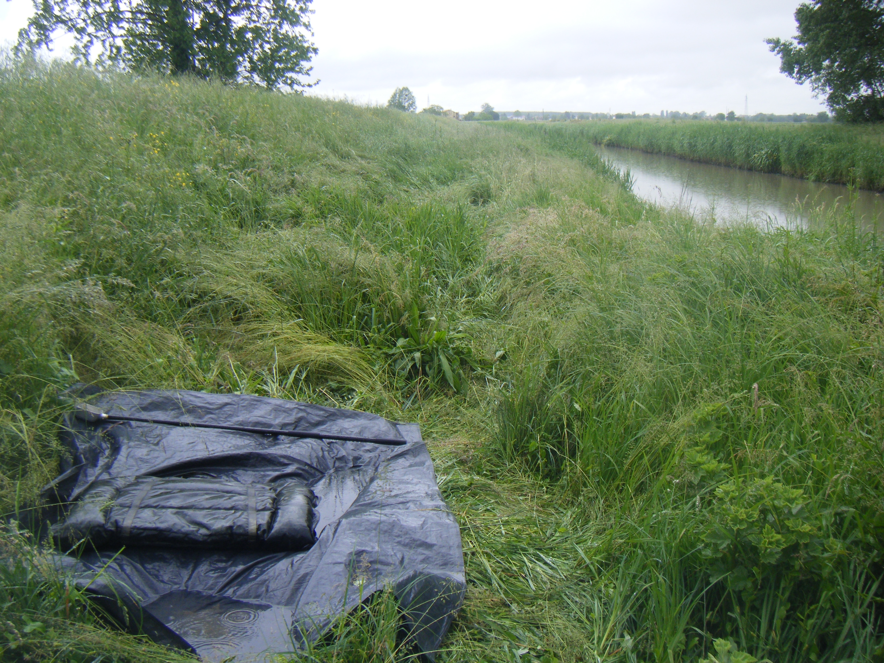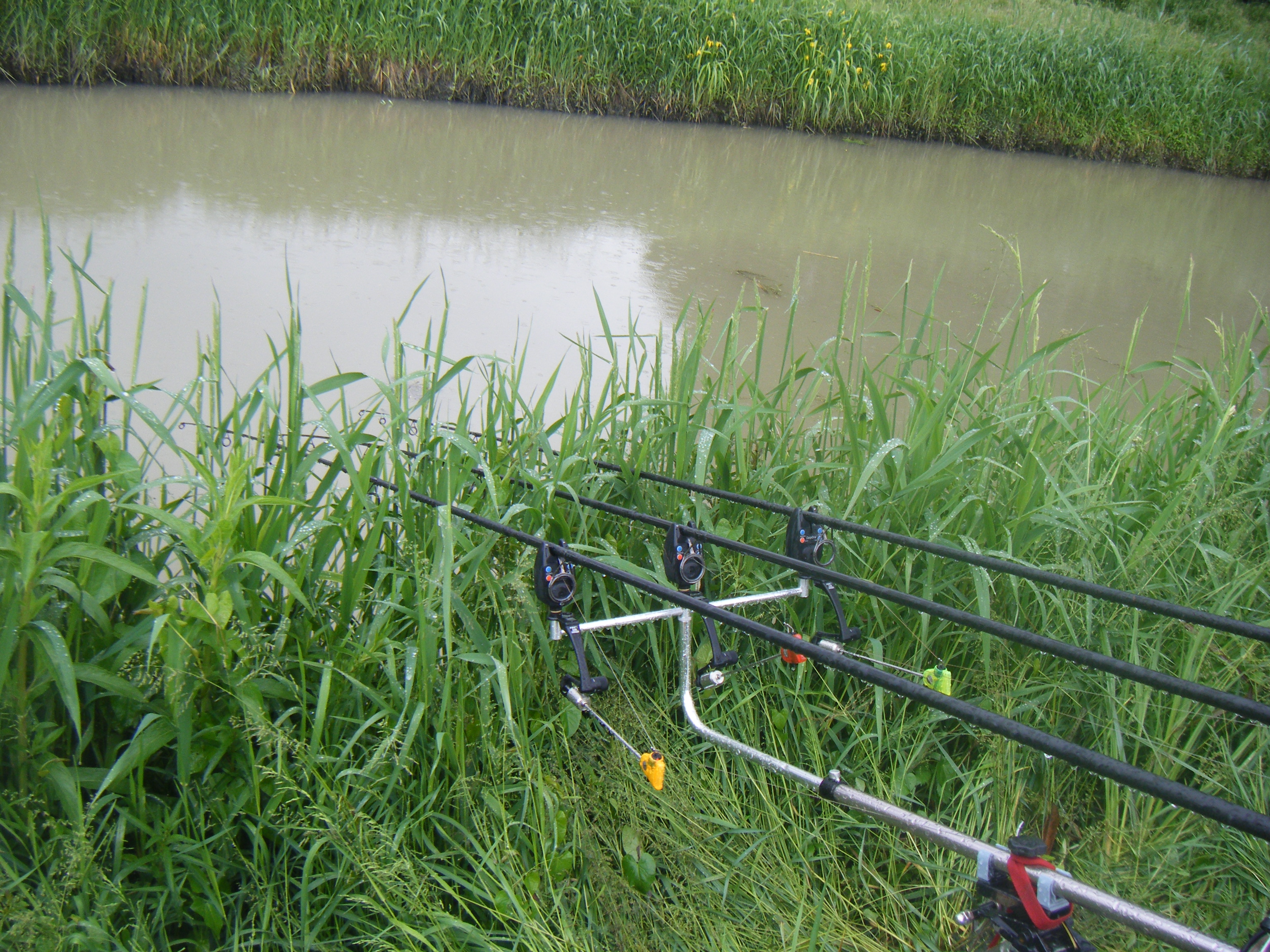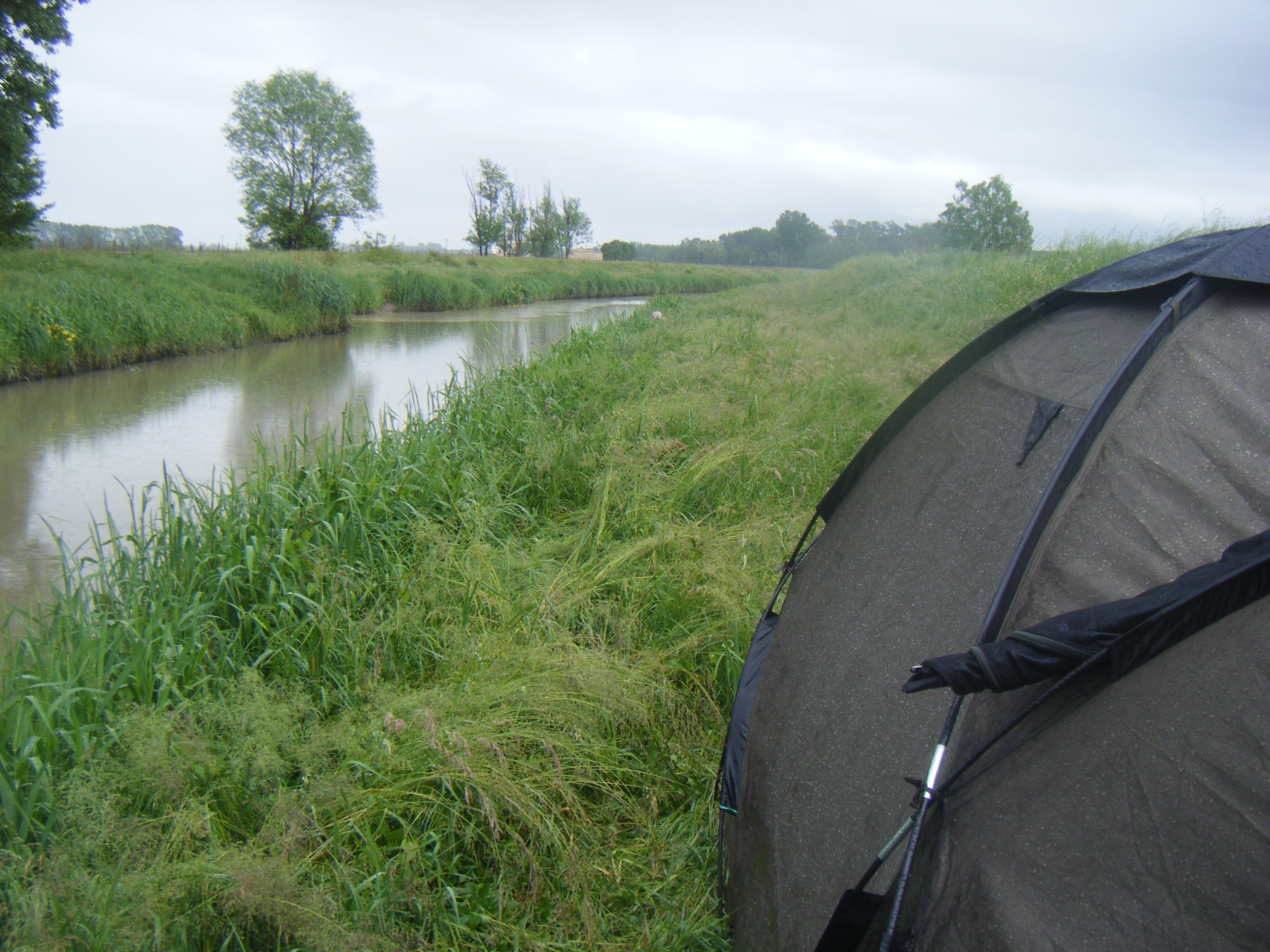 Alle 8 le canne sono in pesca,purtroppo però l'acqua era torbida...Incomincia a piovere allora decido di mettermi in tenda.Viene giù di tutto anche un pò di grandine! L acqua si alza in maniera impressionante e rami e sporcizia varia vengono giù dal canale...