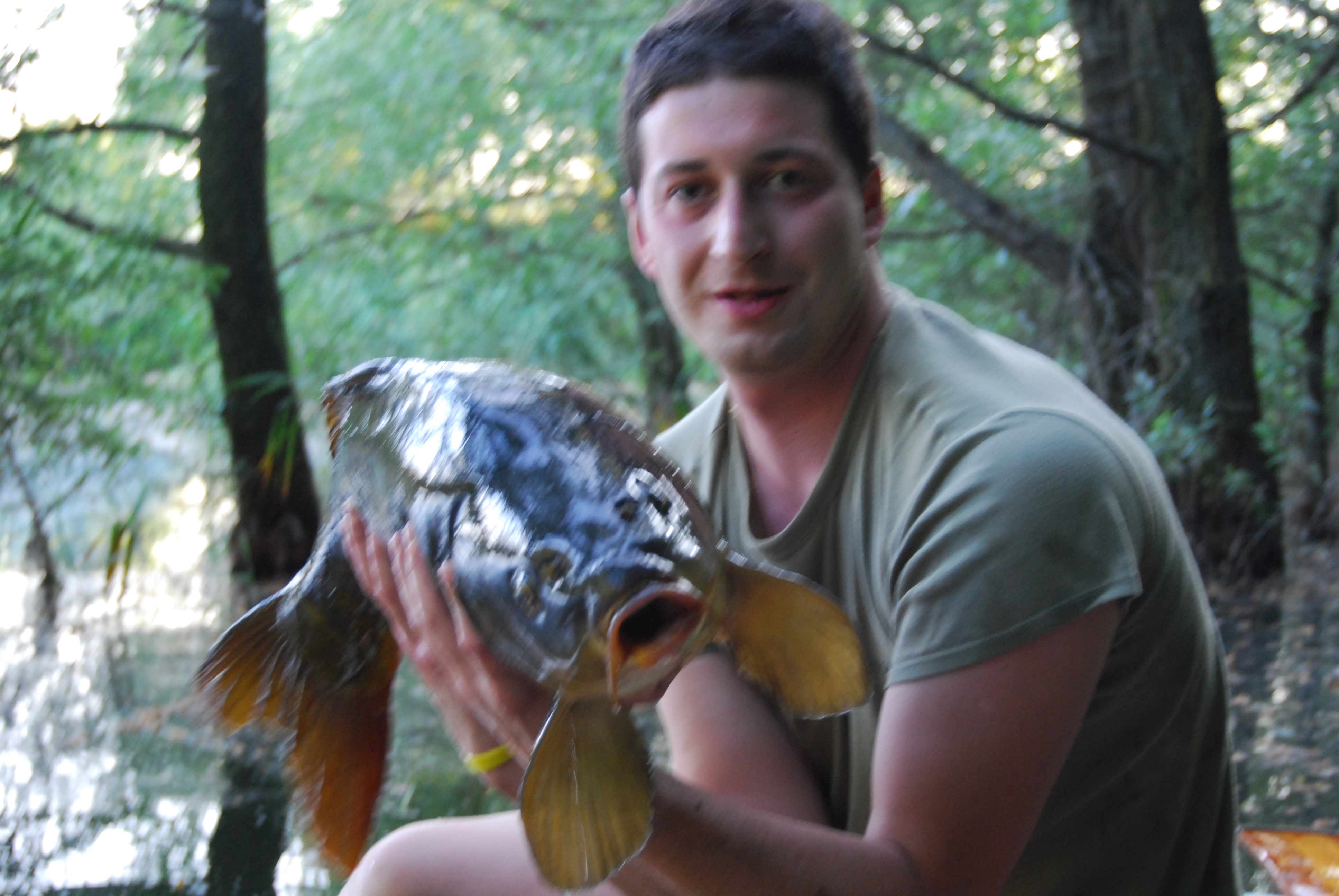 Quello che capita al buon Nick nel frattempo è da non credere, presto ve lo racconterà lui stesso. Corre a raccattare la roba e prima di salire in barca dà un'occhiata al suo pod, lo vede in acqua! IN ACQUA! :augen: :augen: :oops: :oops: :augen: :augen: :astemm: :astemm: Non sa più che fare, panico... si risolve a recuperare una canna e.... ma c'è qualcosa, c'è una carpa attaccata! Io intanto sento un movimento strano, un filo che strisica sul mio, là fuori. Passa un'eternità prima che Nick sia in grado di salire in barca "Mauro! Ce l'ho anch'io!!!!" Cosa? Ma fino a poche ore fa davamo il cappotto scontato ed ora.... si dirige verso l'albero caduto davanti a me. Anche la sua si è intanata, forse, no... "Mauro, è lì sotto, vieni ad aiutarmi da riva, ho perso uno scalmo e da solo non ce la faccio! :astemm: :astemm: " Che... ma non c'è altro da fare, lascio la canna sul pod, apro il baitrunner, vedo che quella se ne va... addio. Incespicando giro attorno e scendo fra i rovi, qui finisco in acqua, porc.... lui è riuscito a portarla a guadino e quasi piange dalla contentezza, "E' stupenda, che bestia!" E' infrascato con la barca in mezzo agli alberi sommersi, rischiando ad ogni secondo di finire dentro riesco a prendere la Mandarina e salto su... fà vedere.... !!!! :25: Un pesce così bello raramente l'ho visto, una specchi scura, perfetta, pinne arancio scuro e non un graffio.... foto, foto!!! Nicola riesce a reggerla a malapena, nella concitazione non abbiamo preso la bilancia ma stimo 13 chili, forse 14, ma chi se ne frega è un pesce fantastico, preso in un modo fantastico, è tutto fantastico!