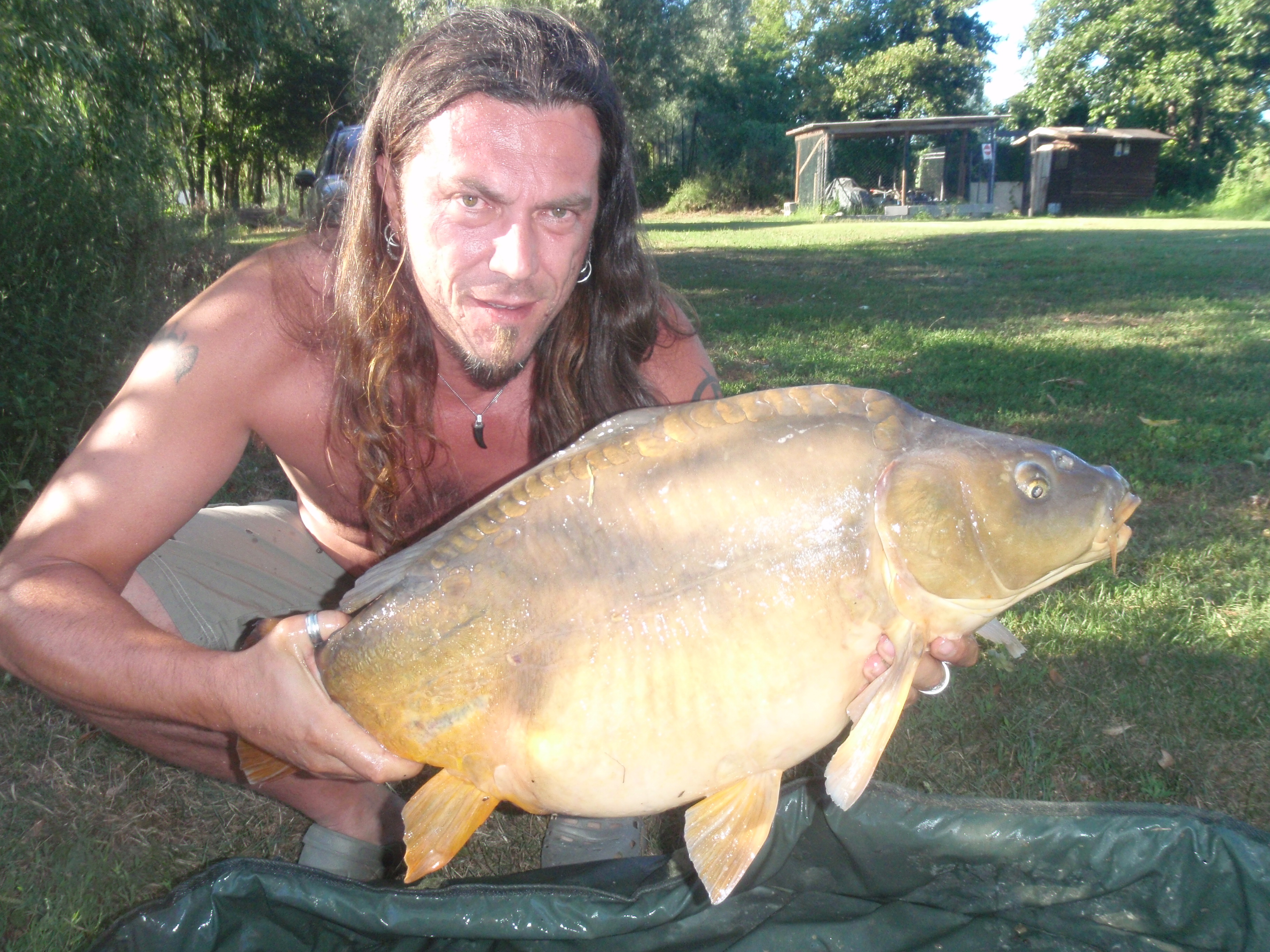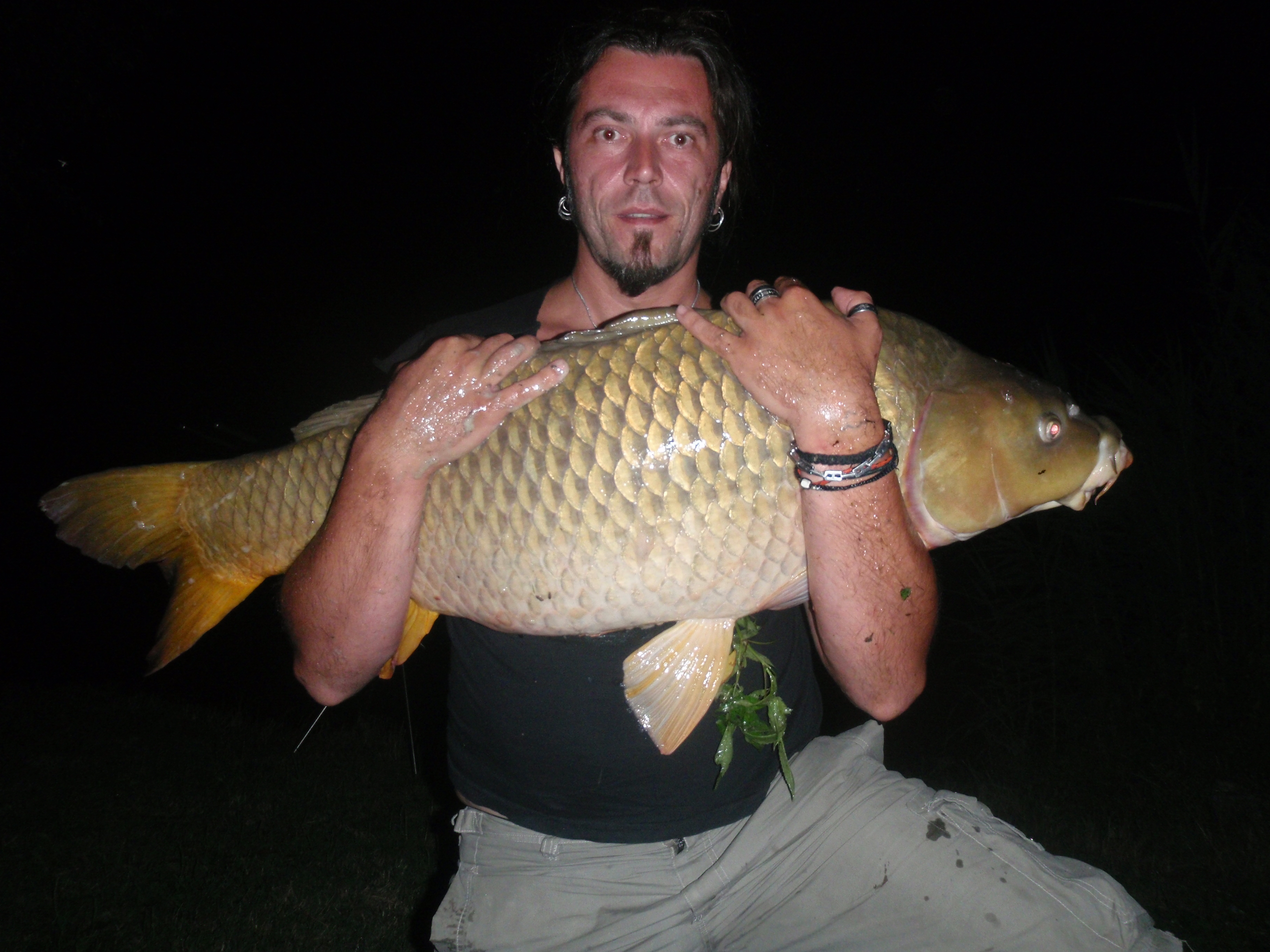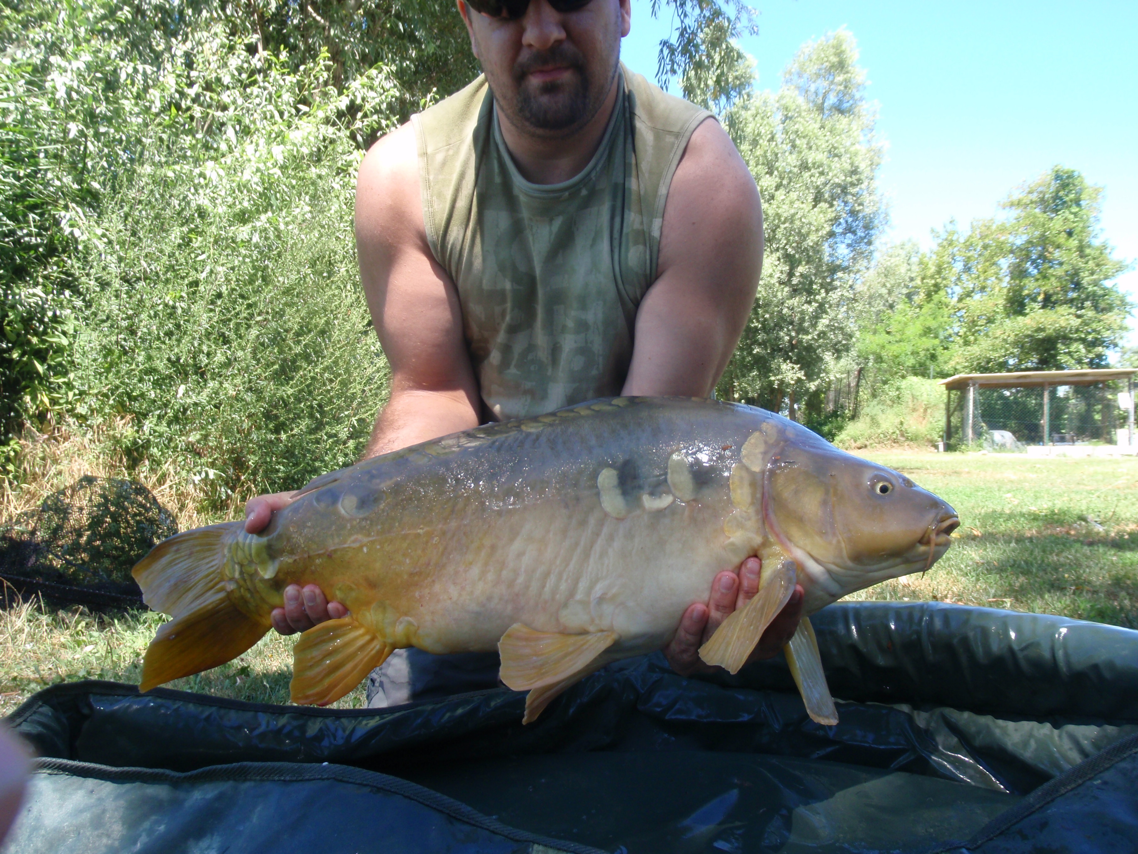 dopo nemmeno 10 minuti la canna più interna di Angelo parte... lui eccitato quasi grida: "è lei! lo so!", la ferra.. non tira tantissimo, io non la vedo bene, non mi sembra troppo gigante... la sguadino e... "occaz***.... è effettivamente grossa"!!! mi ha riempito il guadino! la adagiamo nel materassino (un crocodile della milo, quindi grandino) e lei NON CI STA!!!! il materassino era quasi di misura!!! Non potevamo crederci!! Angelo saltava come un grillo! la carpa.. pure e ha dato una codata in faccia ad Angelo e una schienata nei denti a me... la pesiamo e::: 21!!!!! cavoli! 21chili! Record personale di Angelo, presa il giorno del suo compleanno!!! speravamo arrivasse Max ma era impegnato con clienti, quindi la liberiamo.. non senza farci lavare dal pesce che decide di salutarci con un gavettone!