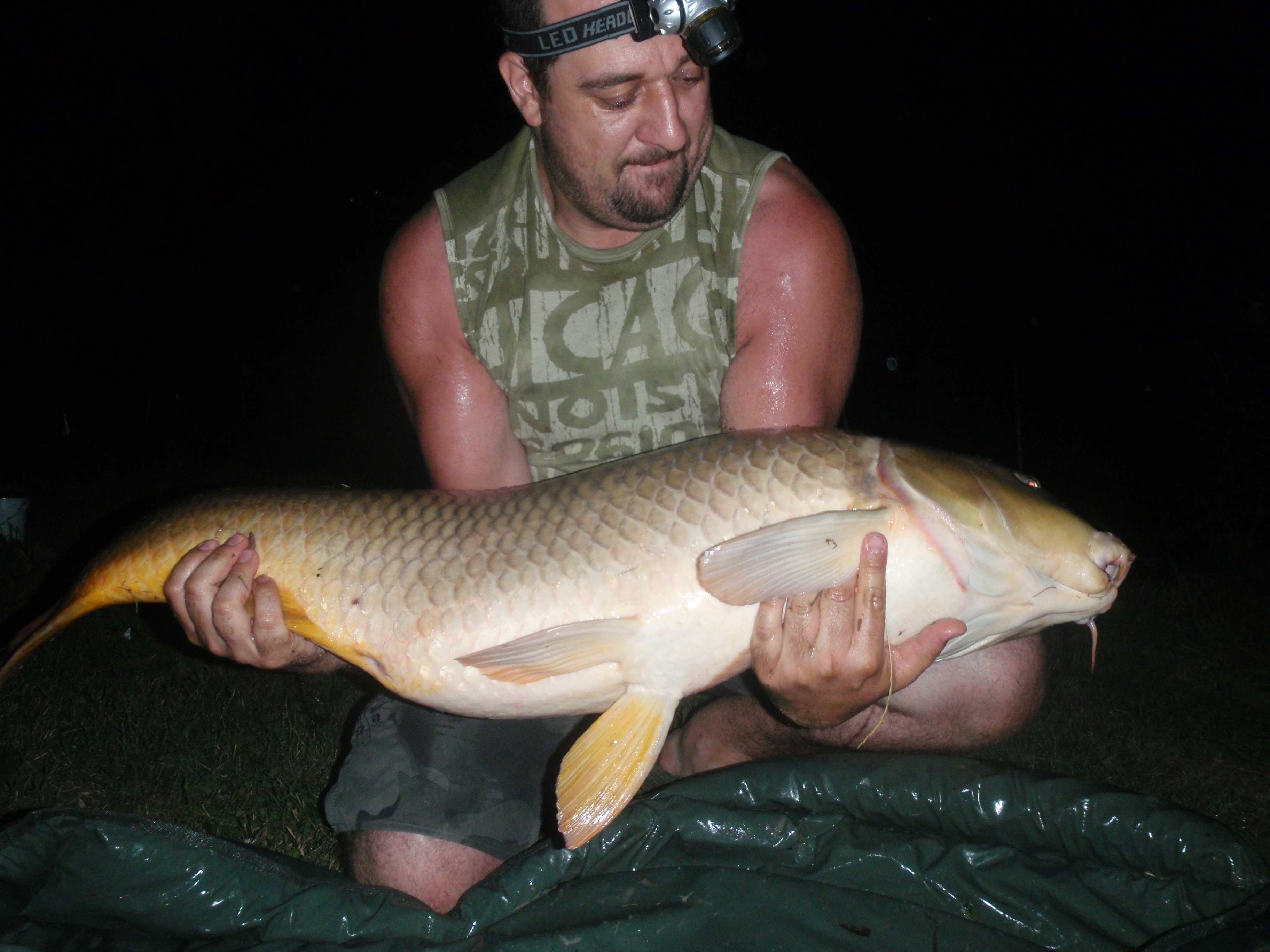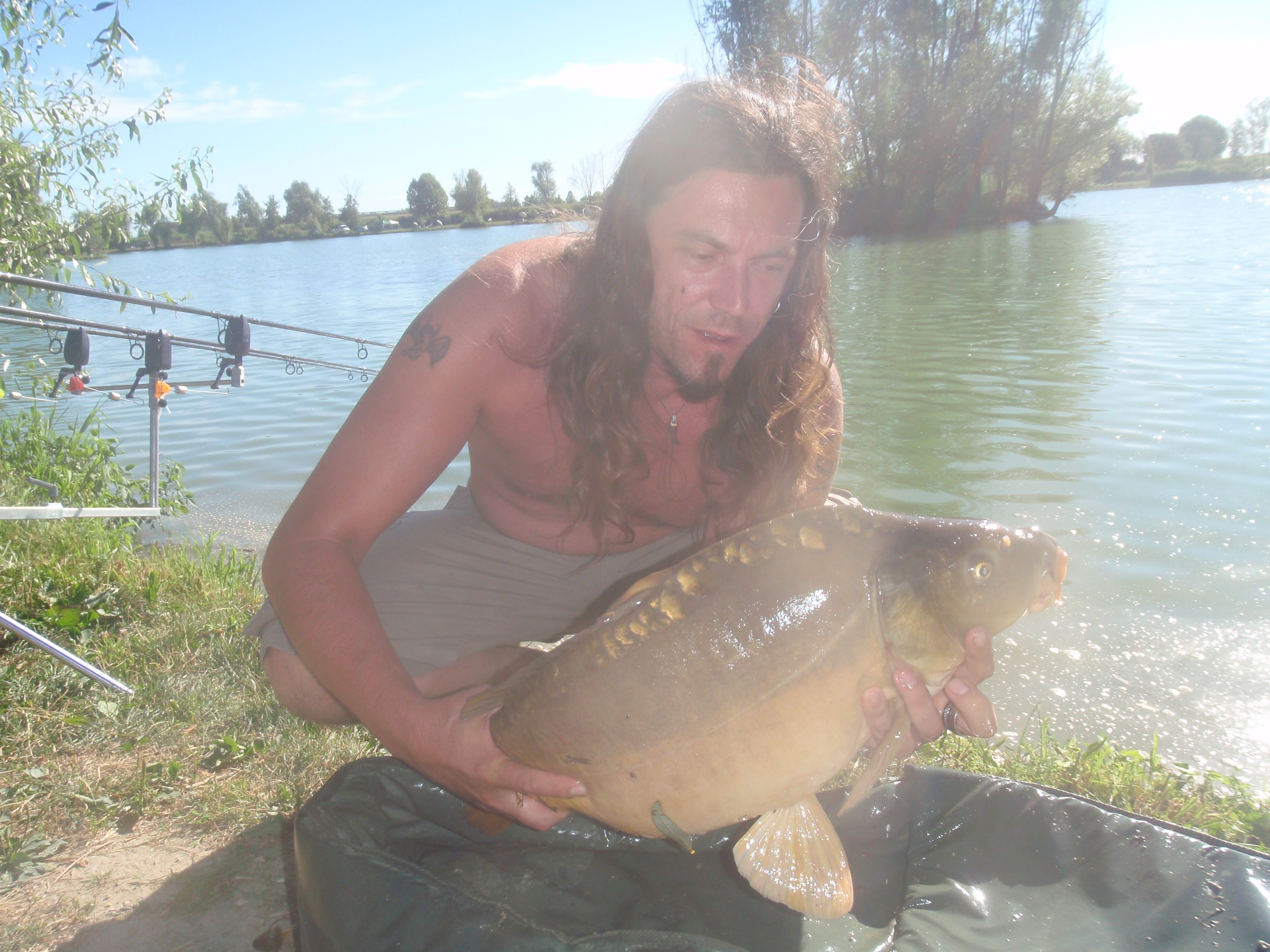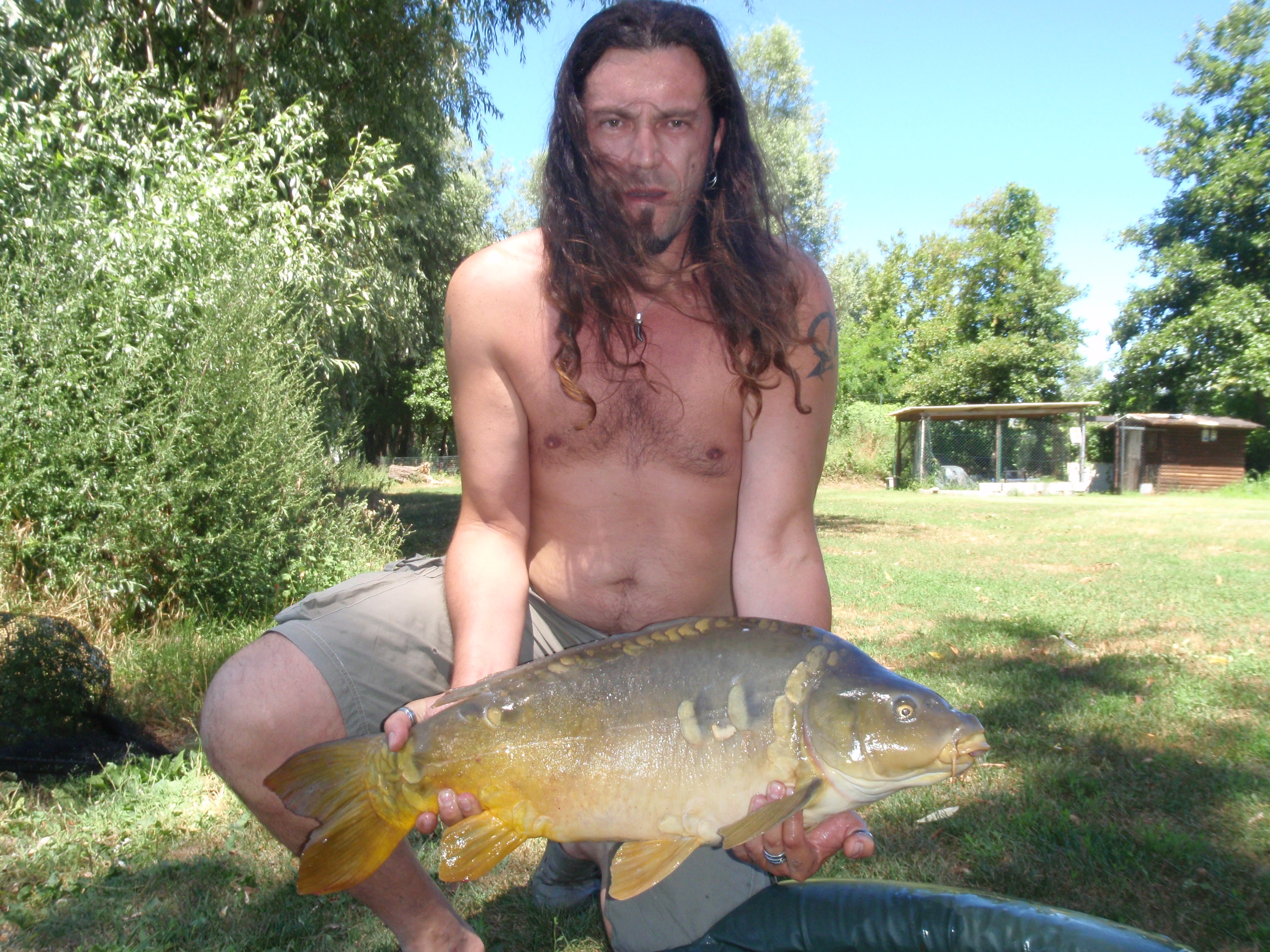 dopo nemmeno 10 minuti la canna più interna di Angelo parte... lui eccitato quasi grida: "è lei! lo so!", la ferra.. non tira tantissimo, io non la vedo bene, non mi sembra troppo gigante... la sguadino e... "occaz***.... è effettivamente grossa"!!! mi ha riempito il guadino! la adagiamo nel materassino (un crocodile della milo, quindi grandino) e lei NON CI STA!!!! il materassino era quasi di misura!!! Non potevamo crederci!! Angelo saltava come un grillo! la carpa.. pure e ha dato una codata in faccia ad Angelo e una schienata nei denti a me... la pesiamo e::: 21!!!!! cavoli! 21chili! Record personale di Angelo, presa il giorno del suo compleanno!!! speravamo arrivasse Max ma era impegnato con clienti, quindi la liberiamo.. non senza farci lavare dal pesce che decide di salutarci con un gavettone!