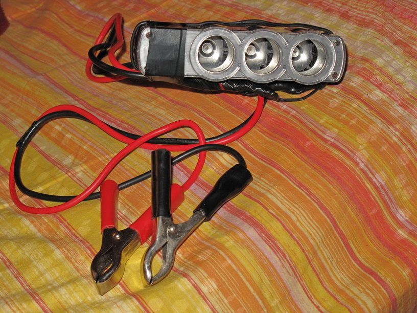 ho adattato questo accessorio prese multiple da accendisigari (circa 2€ al supermercato) per avere più possibilità di utilizzo della batteria contemporaneamente a diversi acessori, come le luci, la tv, la doccia o per pompare da una tanica l'acqua per i più svariati motivi, (per cuocere le tagliatelle), il vortice per gonfiare e sgonfiare il materasso, o ricaricare il cellulare ed il tablet, qui la polarità deve essere rispettata ASSOLUTAMENTE